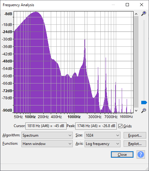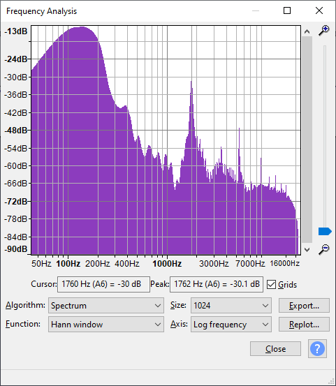 Where the peak is at 1746 but the spectrum drops off notably after that. Maybe I'm missing something with my filter? I only do one low pass filter instead of the two high pass filters that nesdev wiki suggests the DAC chip on a NES does