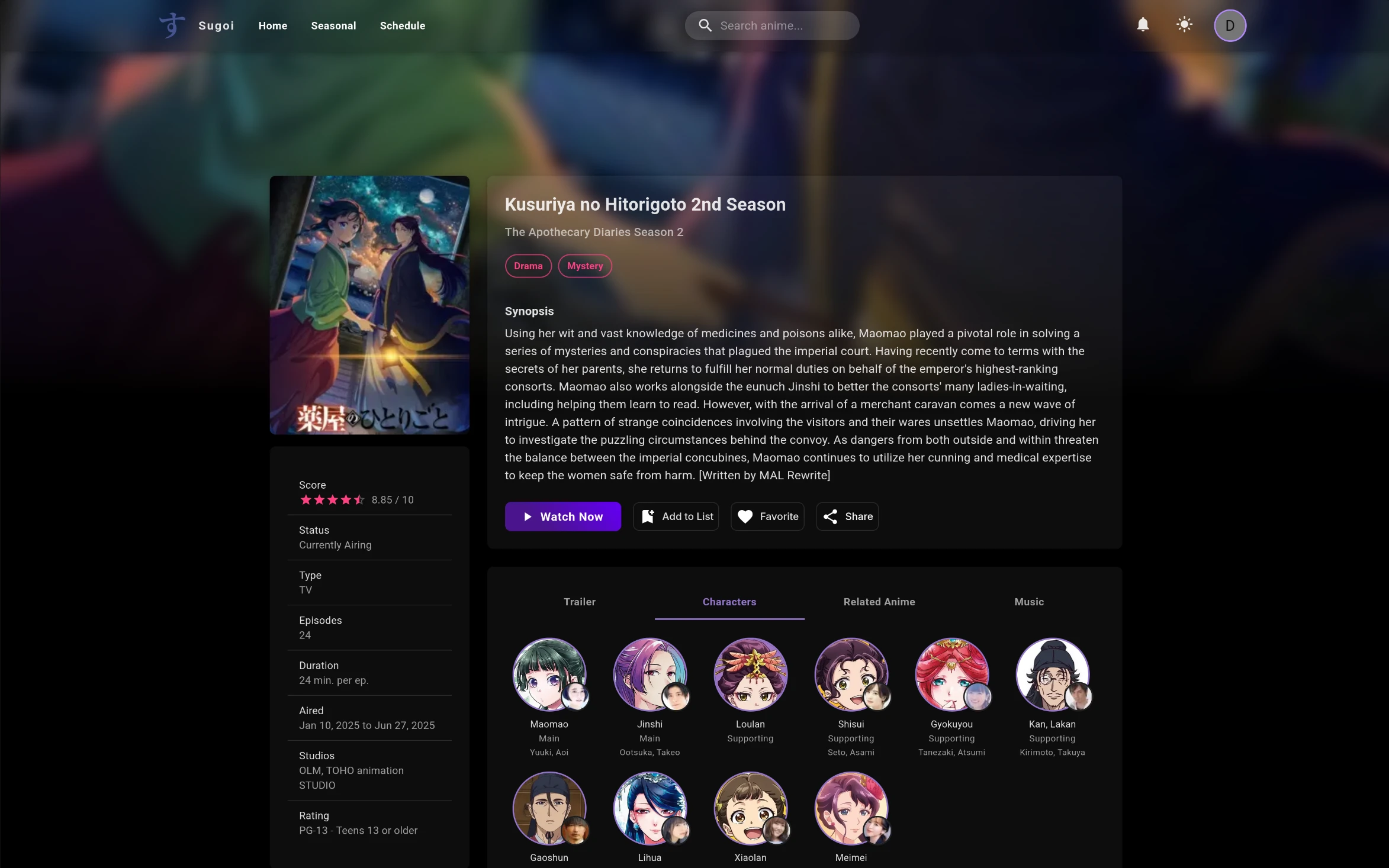- Anime Details: Comprehensive information including synopsis, characters, music themes, and recommendations