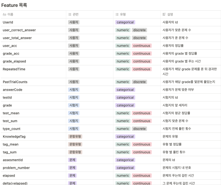 - 각 학생이 푼 문제 리스트와 정답 여부가 담긴 데이터를 받아 최종 문제를 맞출지 틀릴지 예측한다.