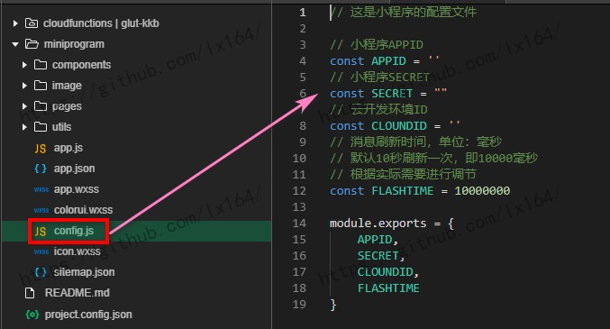 配置文件在 App/miniprogram/config.js ,填写以下的配置信息: