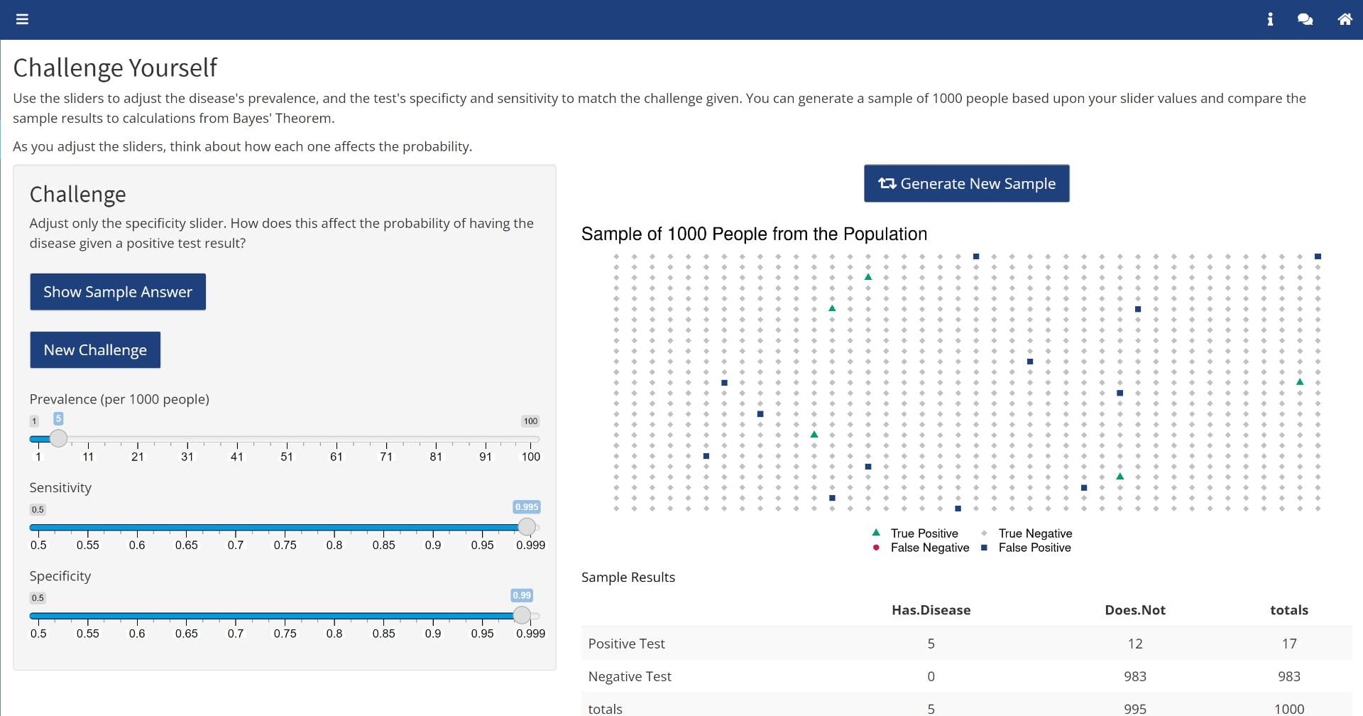 This app is designed to demonstrate Bayes' Theorem using the classic example of disease incidence.