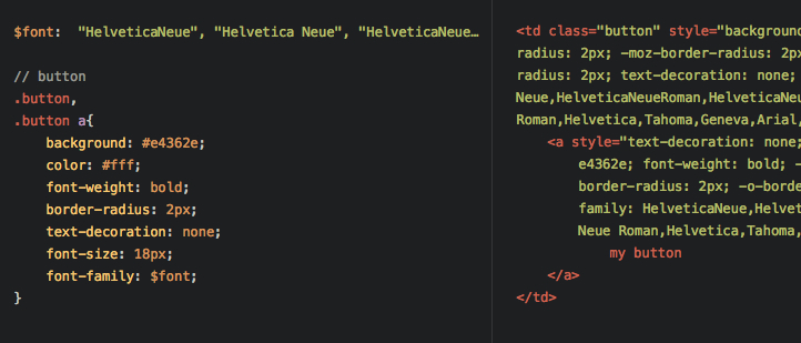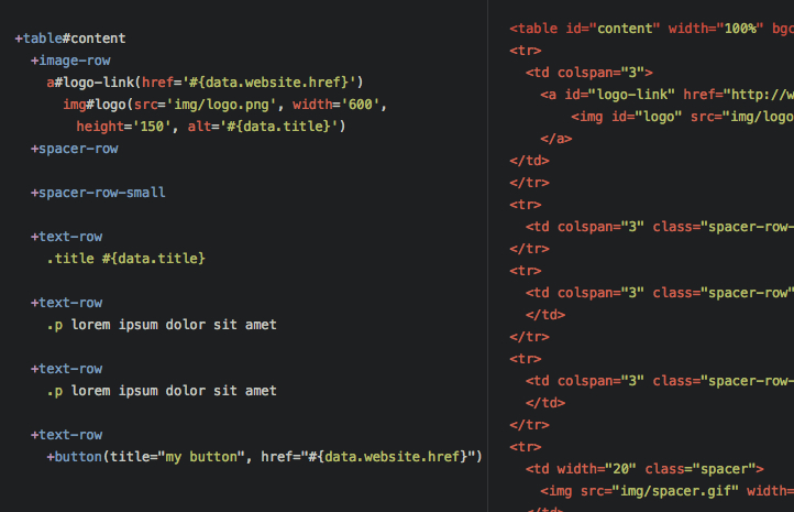 HTML tables are hard to write and hard to read. This is why you should use some form of preprocessor to make this job easier. We use jade mixins for tables, buttons and spacers so you don't have to spell those out again and again.