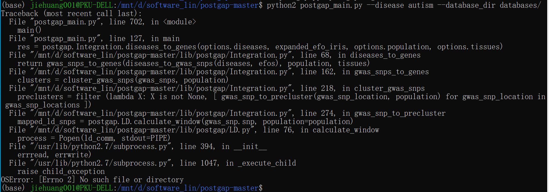After I renamed the folder postgap to postgap_master, and also renamed POSTGAP.py to postgap_main.py, the previous error message of "No module named GWAS" went away. I am using the Ubuntu linux coming with Windows 10. Maybe there is some issue with the uppercase and lowercase of file names.
