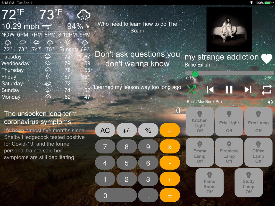 With Homebridge-Display, you can control and view Spotify, see the weather forecast and current conditions, see news articles, control some homebridge devices, and much, much more!