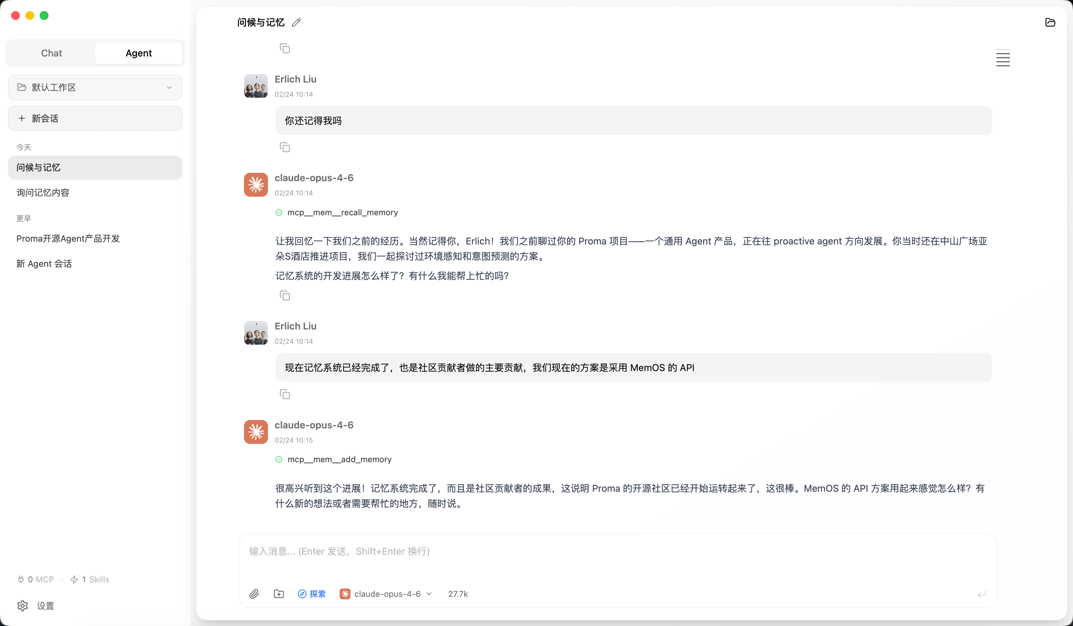 Proma 记忆功能,Chat 和 Agent 共享记忆,让 AI 真正了解你、记住你的偏好和习惯。