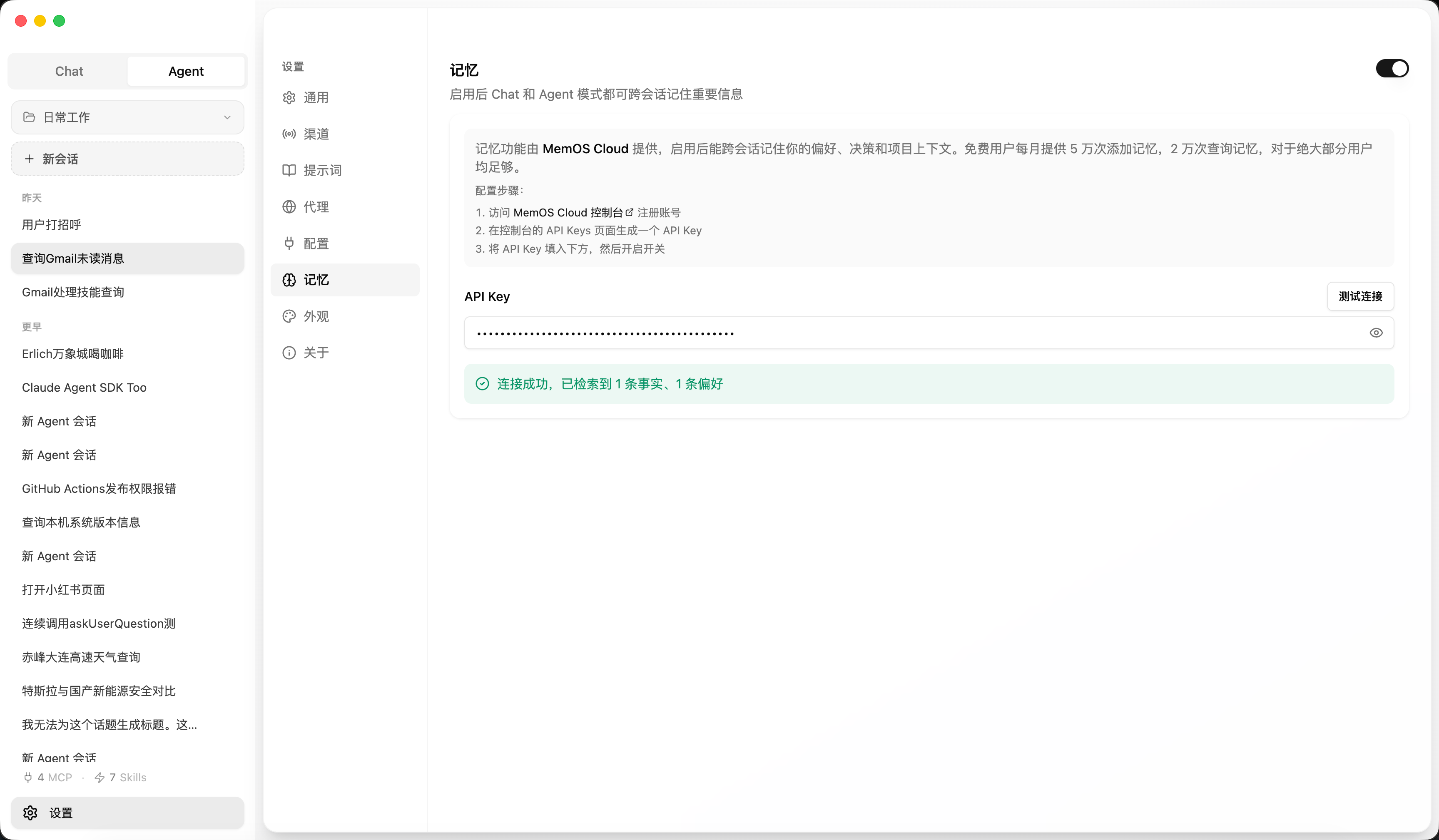 - 记忆功能 — Chat 和 Agent 共享记忆,AI 记住你的偏好、习惯和上下文,跨会话持续理解你