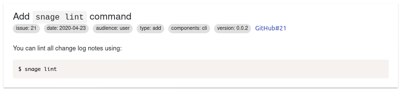 Snage uses Snage for its own changelog. Have a look at it on changelog.snage.dev.