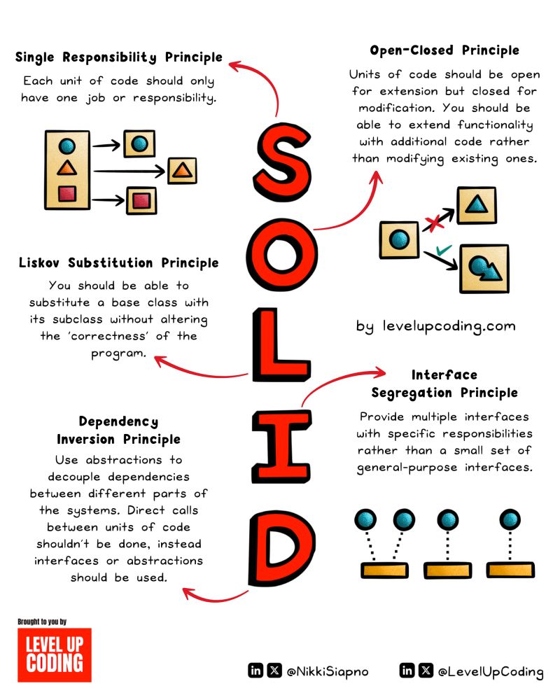 - O: Abierto para extensión, cerrado para modificación. Esto se trabaja la herencia y inyección de dependencias.