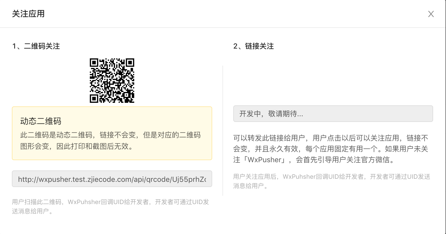 wxpusher,然后点击「我的」-「我的UID」查询到UID; - 通过创建参数二维码接口创建一个定制的二维码,用户扫描此二维码后,会通过用户关注回调把