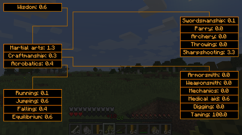 Welcome to the Iblis wiki! Iblis mod add a two separated attribute systems. One set of attributes can be raised using vanilla Minecraft experience levels (which I will call "characteristics") and second set is trainable skills.