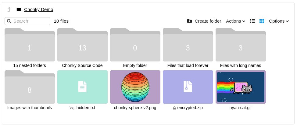 Chonky is a file browser component for React. It tries to recreate the native file browsing experience in your browser. This means your users can make selections, drag & drop files, toggle between List and Grid file views, use keyboard shortcuts, and much more!