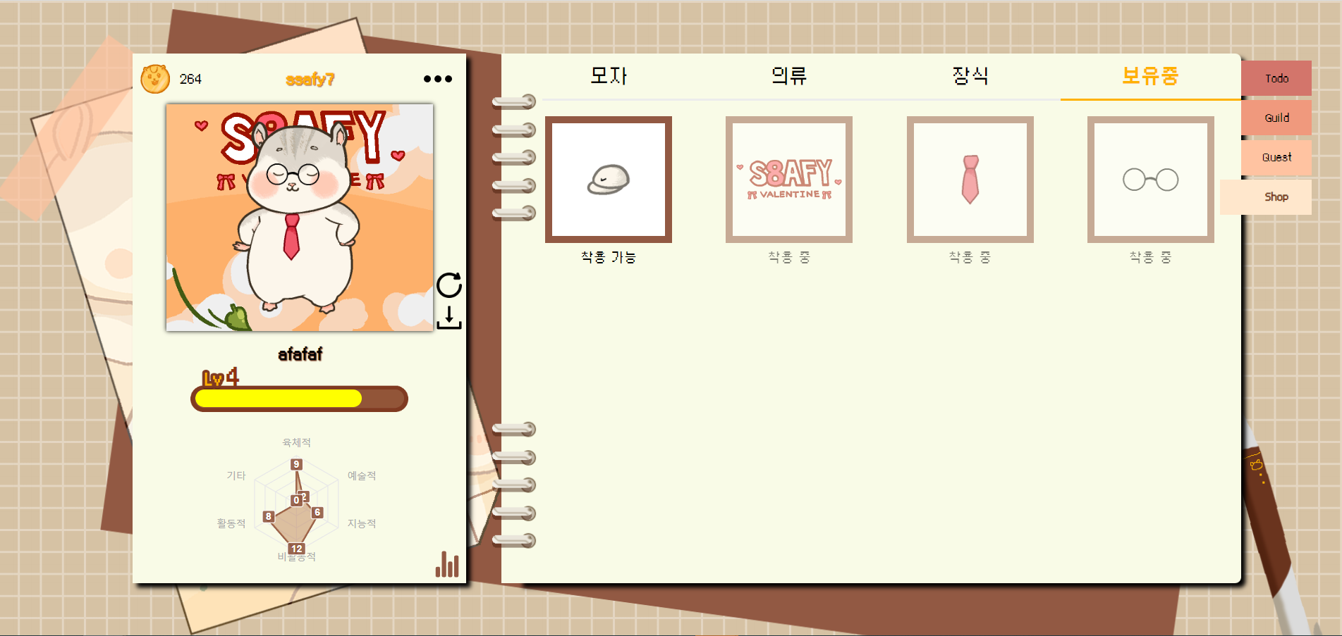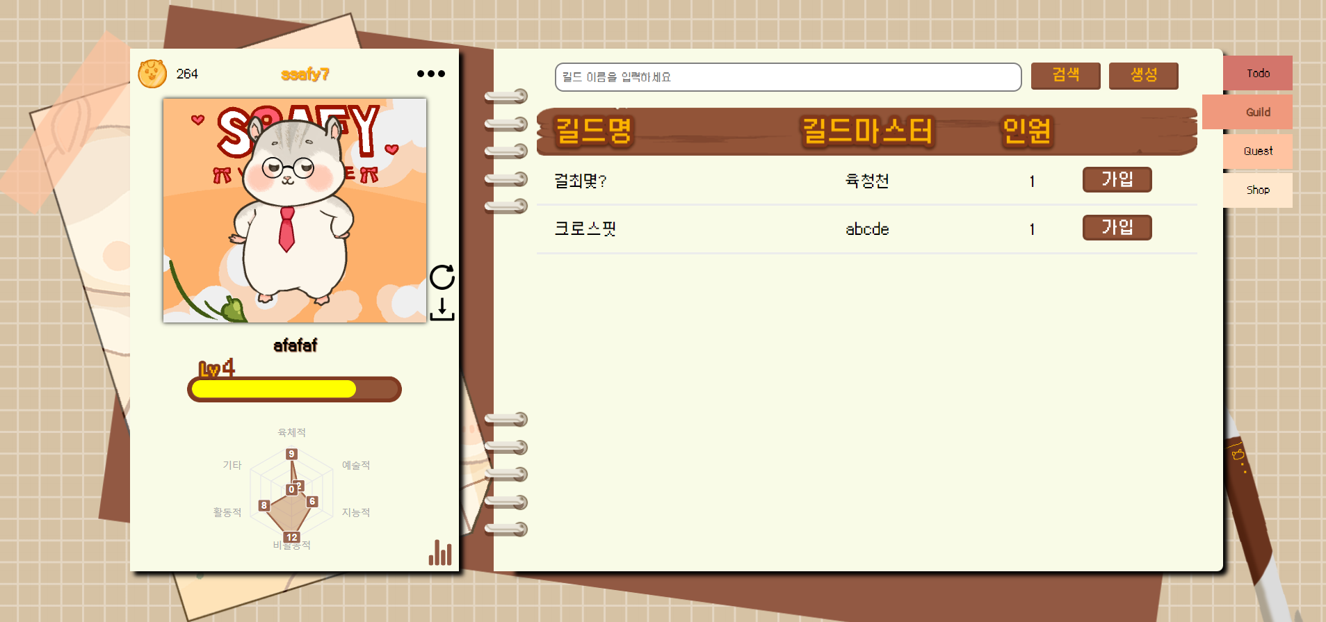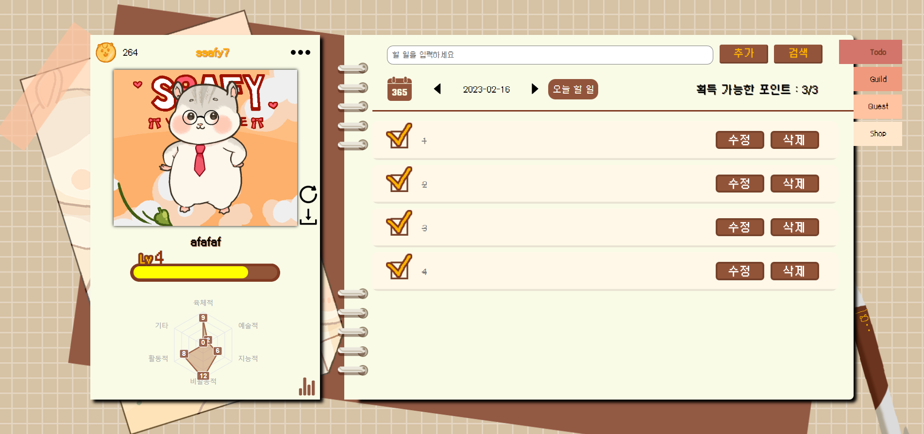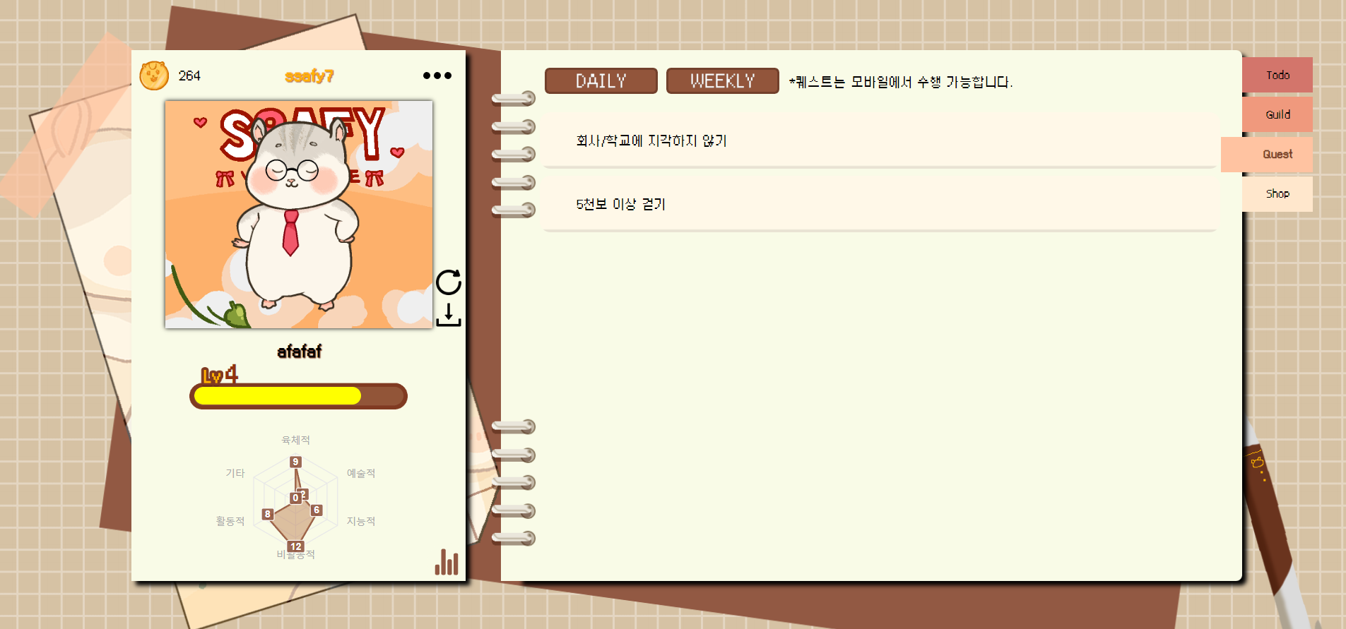 그래서 저희는 계획과 퀘스트를 완료하여 사용자를 투영한 햄스터를 성장시키며 성취감과 재미 모두 느낄 수 있는 서비스를 제작하였습니다.