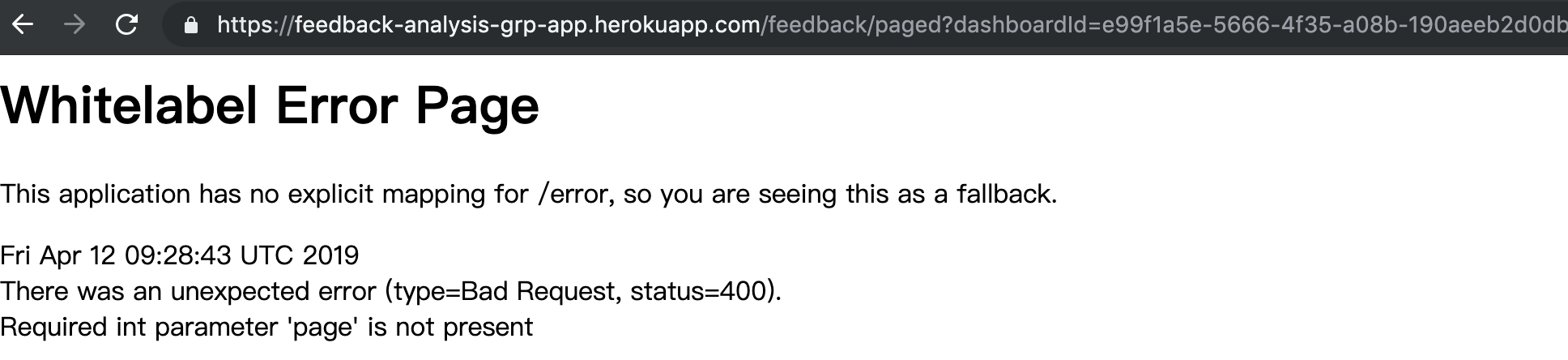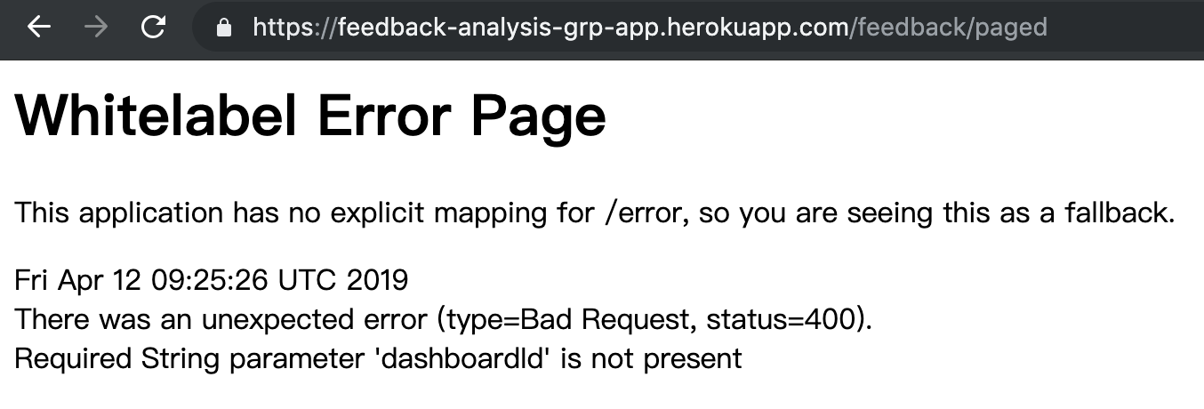 This should respond with something like Parameter missing: dashboardId. instead. (Just like what we did on the feedback one: if the rating is missing or exceeded, some hints will be prompted.)