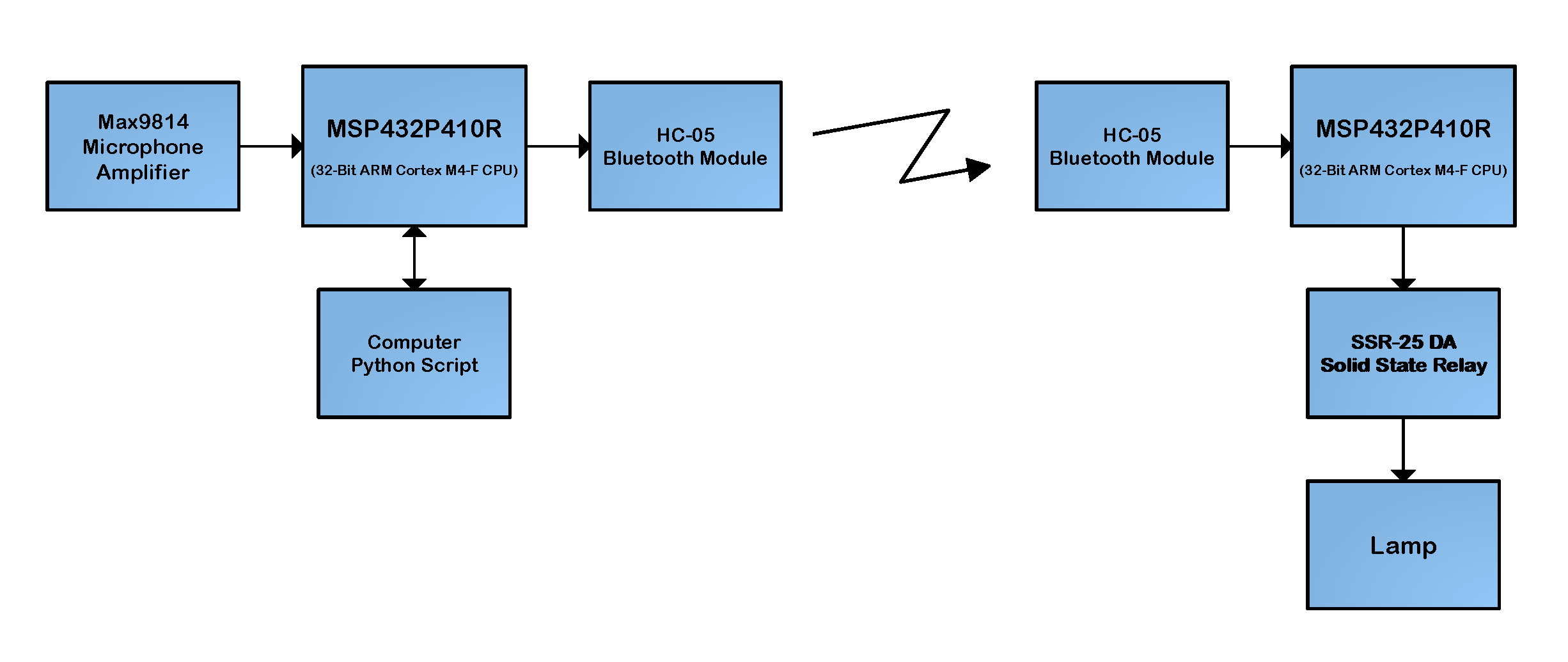 You will need a MAX9814 Microphone, two MSP432, two HC-05 Bluetooth modules, a solid state relay, and a computer with Python2.7.