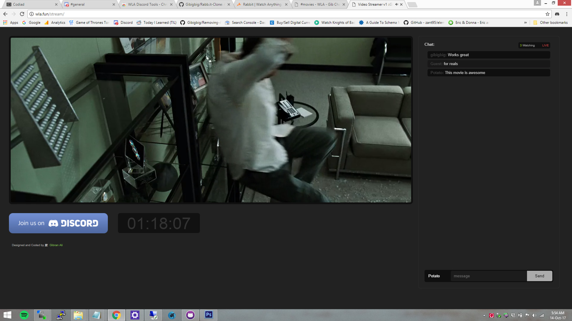 My friends wanted a quick place to stream videos and chat together but we didn't have a fast enough upload speed for www.rabb.it so I put this together in an hour or two. It does what rabb.it does with the exception that the source is streamed from a remote file through VLC player on a server. That way we can download 1080p movies to the server (via transmission etc) and have a stream playing in a matter of seconds.