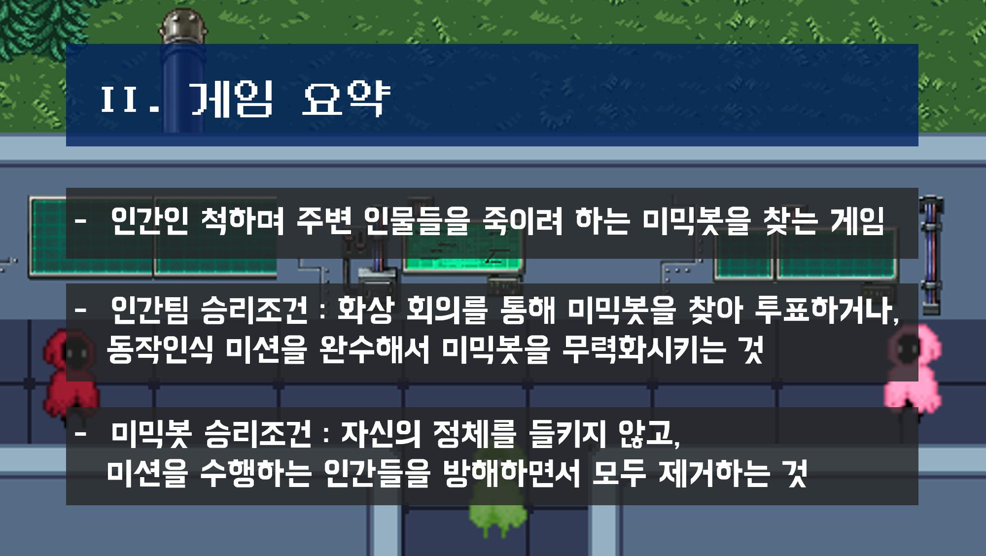 - 시민 플레이어는 미션을 해결하고 시체를 신고할 수 있음