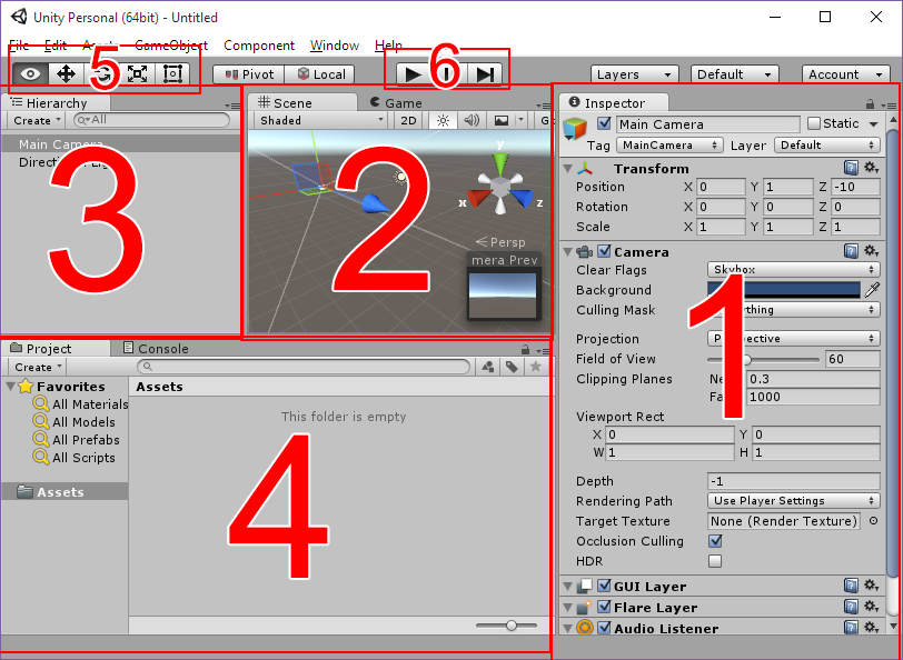 ###Unity Layout Unity features a layout that is modular and customizable. Below is the "Default" layout and an explanation of the important panels.
