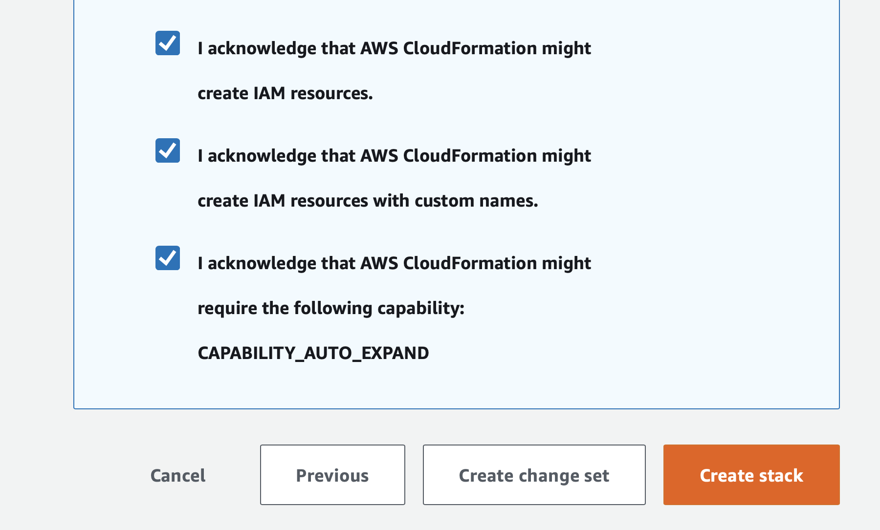 This will bring you to either the Cloudformation UI or the AWS console if you are not signed in. Sign in, if you are not already. From the Cloudformation UI, click "Next" at the bottom of the screen. Repeat clicking "Next" on the two following pages. You will reach a page with this towards the bottom: