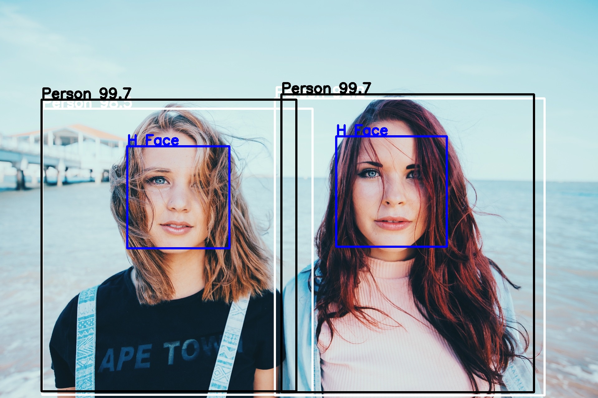 The white bounding boxes around the humans is from OpenCV's Deep Neural Network (DNN). The DNN, in this project, uses the "Faster RCNN Inception Version 2" model. However, you can use any OpenCV DNN compatible model you'd like. This DNN model shows a slightly lower confidence for the humans at 98.5 and 92.2.