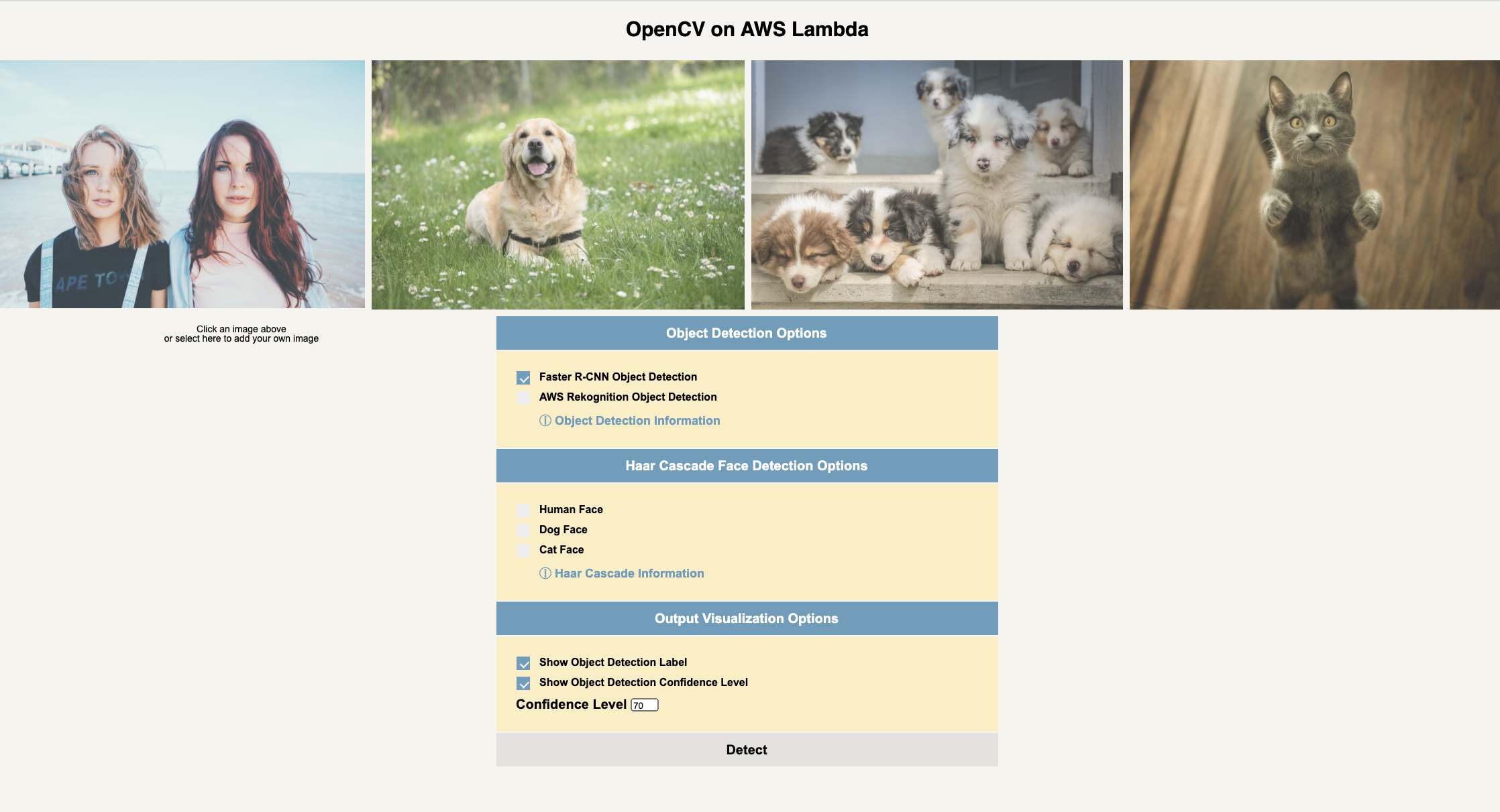Serverless Object Detection using OpenCV on AWS Lambda. Compare AWS Rekognition, OpenCV DNN, and OpenCV Haar Cascades image results directly.
