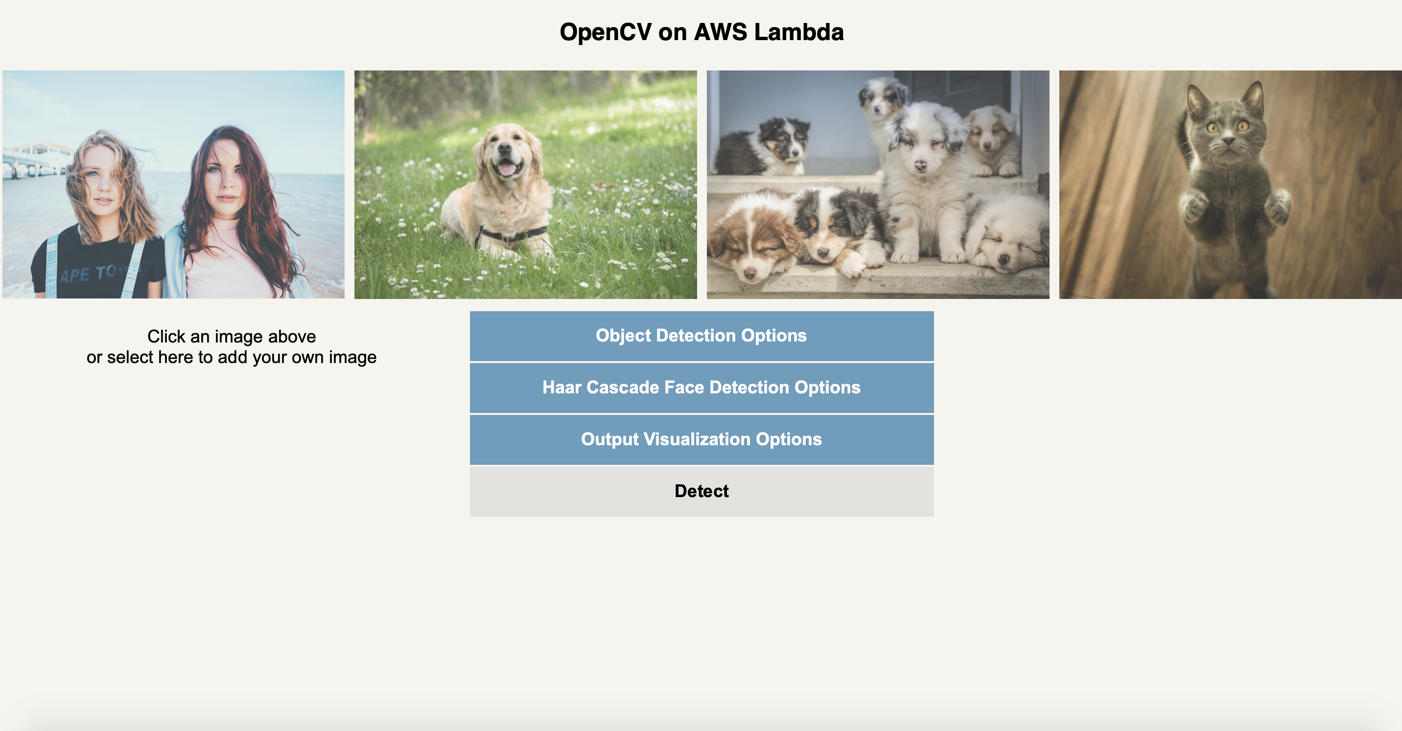 - Navigate to S3. You should see a bucket named "opencv-demo-xxxxxxxx", where "xxxxxxxx" is the unique stack identifier from CloudFormation. Open this bucket. You will see an "index.html" file. Open this file. This webpage will appear: