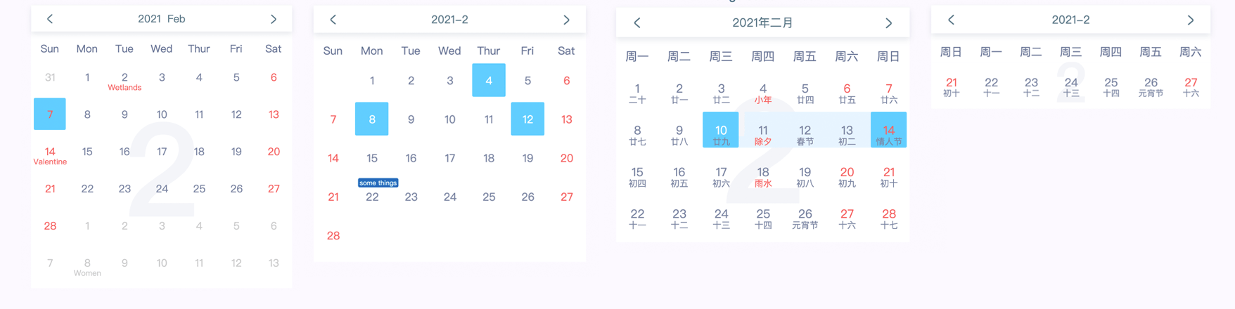 mode | String | 'month' | Configure calendar display mode, the modes has 'month', 'week','monthRange' |