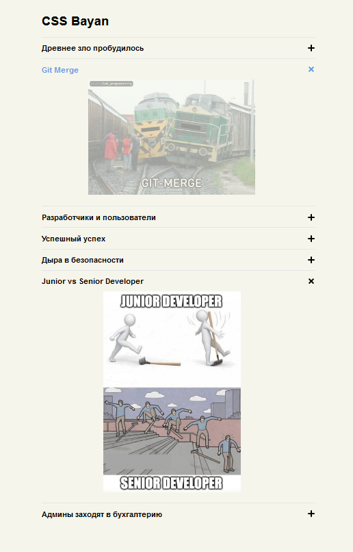 Лучший способ скрытия переключателей (радиокнопок) - это установить свойство "display: none". Но элемент, для которого задано значение "display: none", полностью удаляется из потока документа, поэтому он не отображается в дереве элементов, в отличие от "visibility: hidden". По условиям задачи все блоки аккордеона должны быть в основном потоке DOM-элементов, поэтому пришлось использовать свойство visibility.