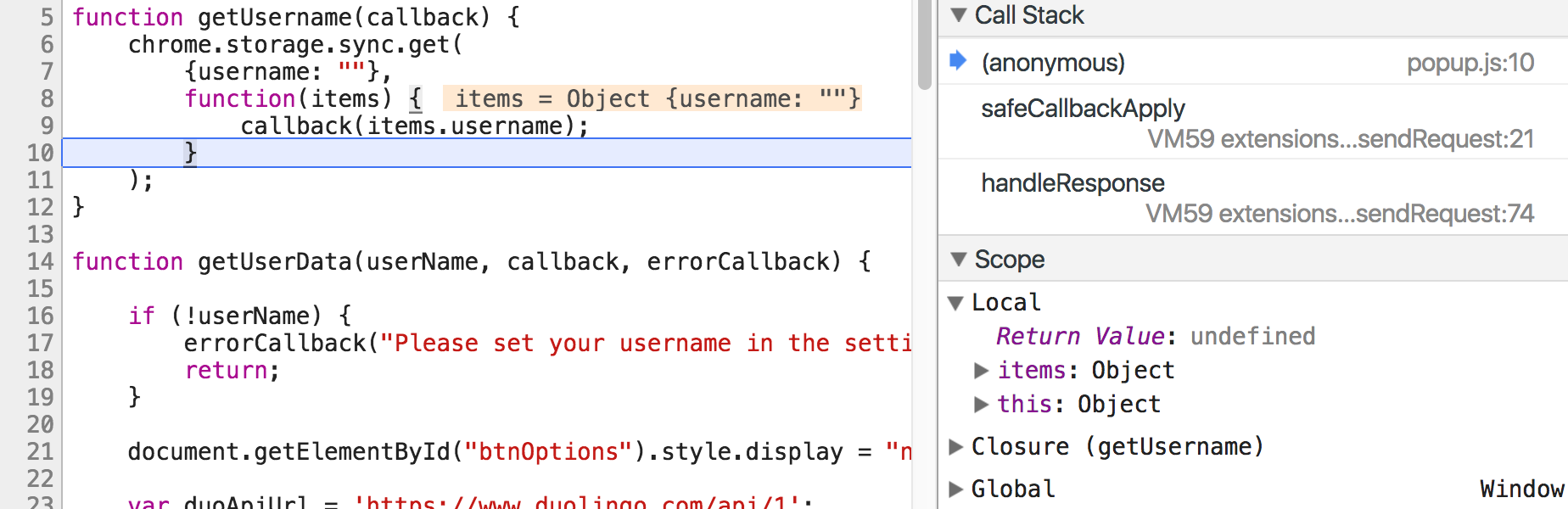 function (items) { callback(items.username) }here we can 'see' the local scope variables, and we can see the variables of the outer scope created by the function that encloses us, which is getUserName (you can check on the right of the screenshot the debugger is so kind to tell us that this is called a 'closure'). from where we are, we can also see the most outer scope, the global scope.