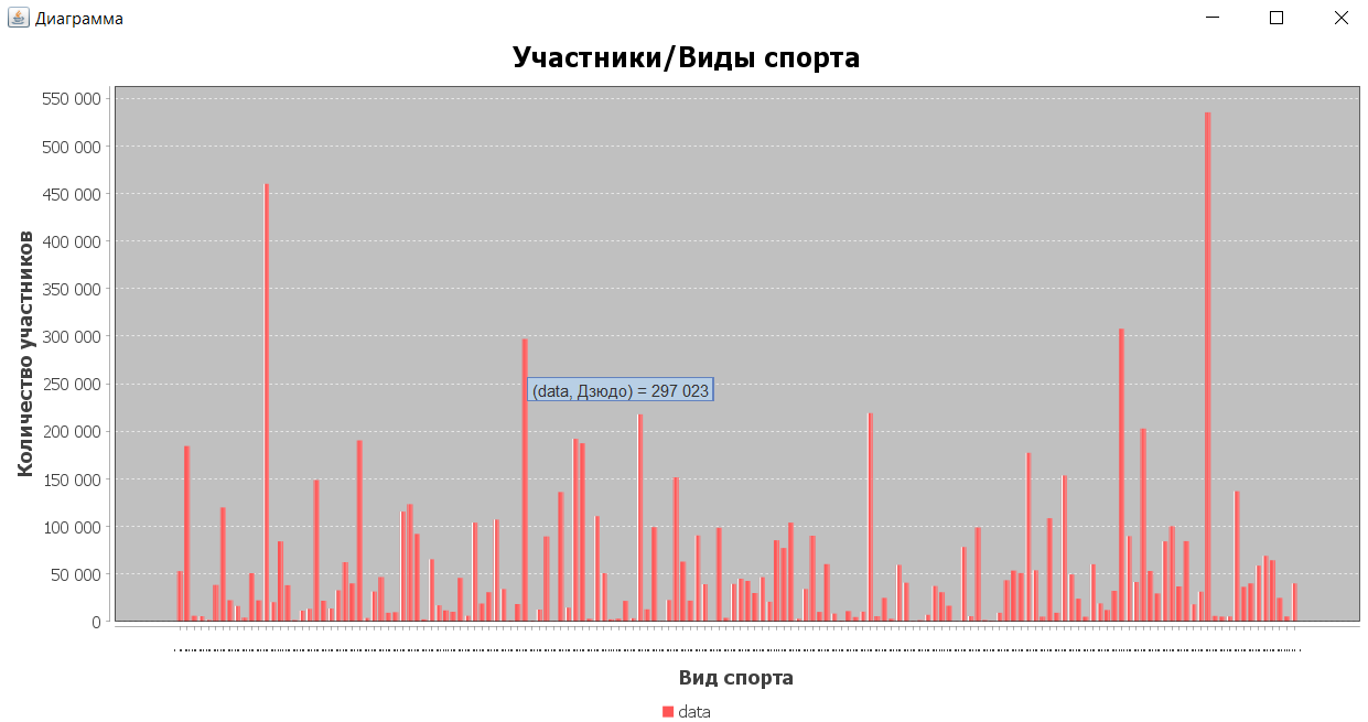На OX не видно видов спорта, так как их очень много (>100), но если навести мышку на столбец, то можно узнать по нему всю информацию