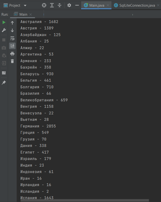 - Создан класс SqlLiteConnection, который отвечает за соединение с базой данных, за запись в нее чего-либо, также в нем хранятся методы, делающие запросы к бд Методы FirstTask(), SecondTask(), ThirdTask() отвечают за запросы по 1ой, 2ой и 3ей задачам соответсвенно
