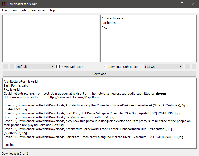 The two list windows are where users (left) and subreddits (right) will be displayed after they are entered. To add users or subreddits to the list you must first create a list name by right-clicking the drop down boxes under the corresponding windows. When you run the downloader, only the lists that are displayed in the combo boxes will be downloaded. The checkboxes under each list dictate which list will be downloaded. Checking both will download only user content that is posted to the subreddits in the subreddit list.