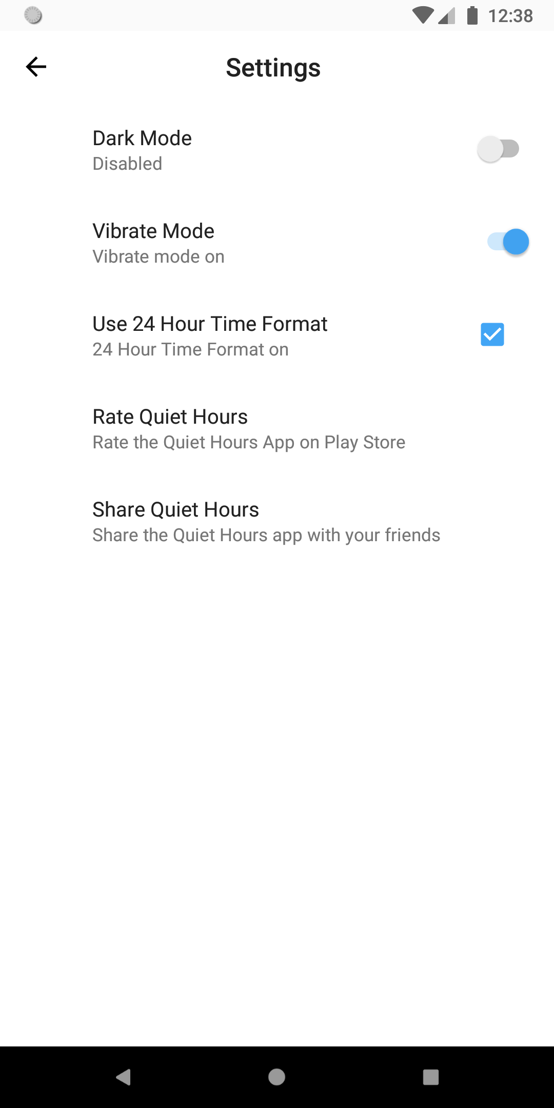 Quiet_Hours No more trouble to make silent mode ON/OFF manually every time. This App will ensure that your mobile device enters and exits the Silent Mode or Vibration Mode between a given period of time. Screenshots Icons made by Freepik