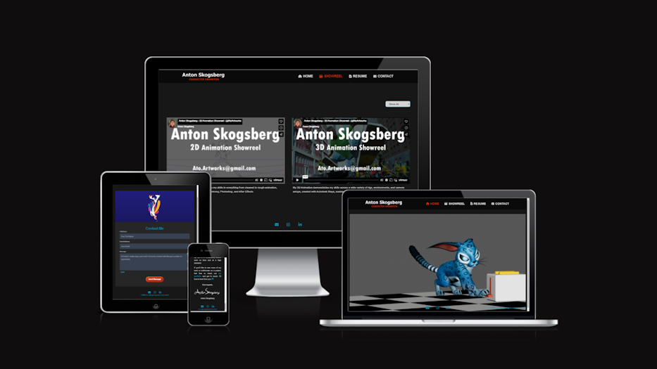 Anton is designed to display Anton Skogsberg's professional background in animation, including both 2D and 3D portfolios. The website provides information on his work experience, skills, and the software he uses, along with a contact form for potential inquiries.