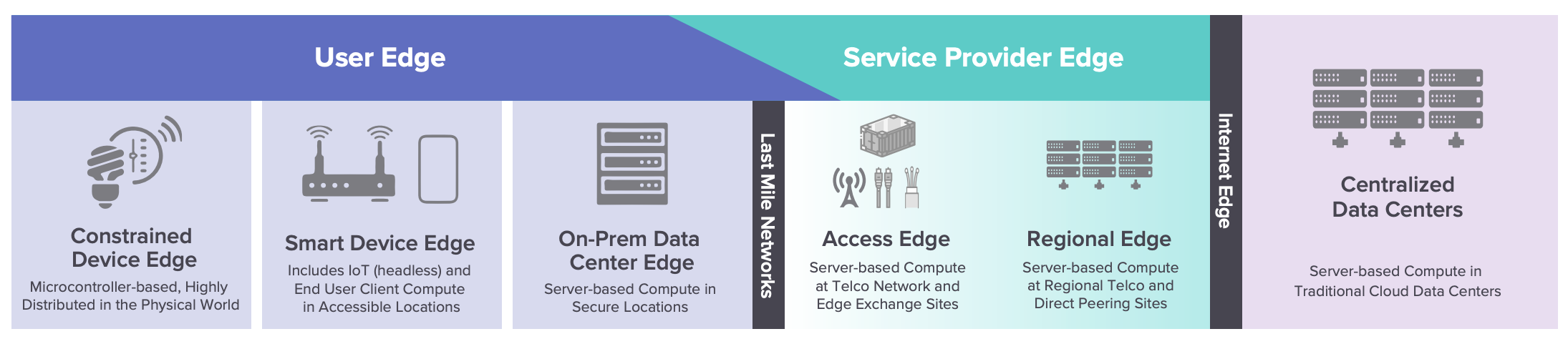 | 有多种边缘计算定义存在,但本文将重点关注基于数据处理所处的地理位置的边缘计算。基于地理位置的边缘被分类为多个类别,具体取决于与用户的距离。下图显示了根据 [Linux 基金会边缘白皮书](https://www.lfedge.org/wp-content/uploads/2020/07/LFedge_Whitepaper.pdf) 定义的类别。 | ||
