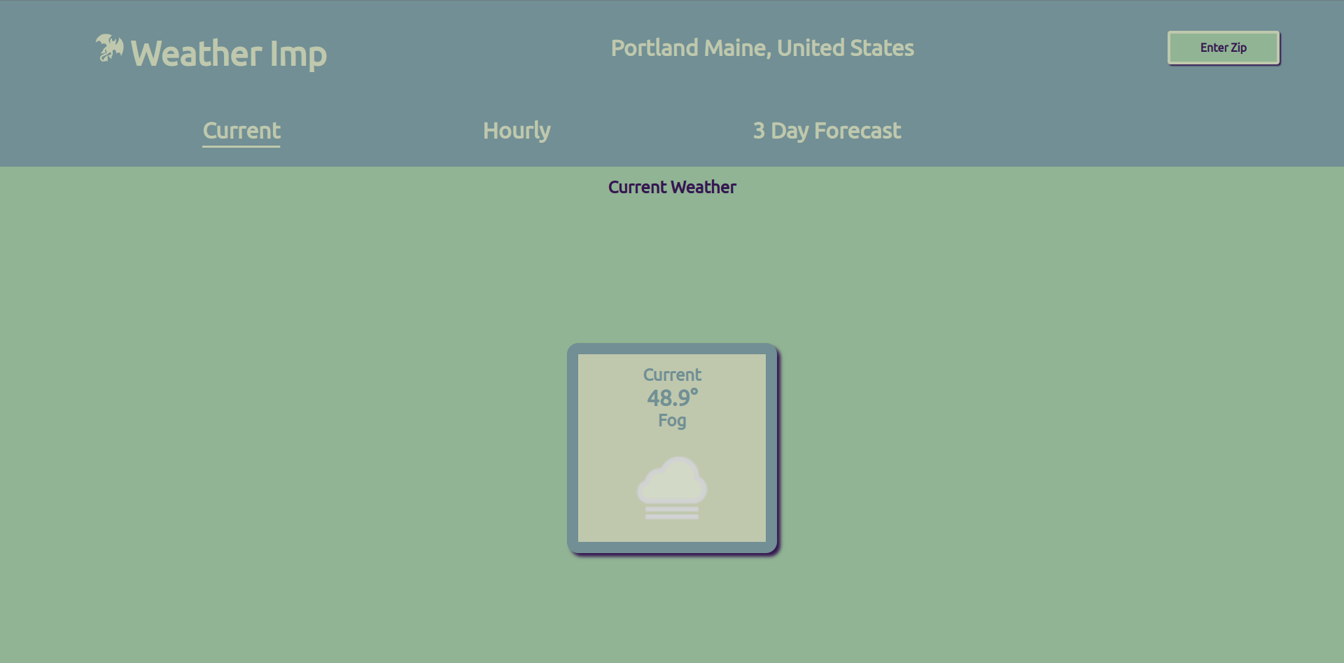 On the home page a user can choose to use their device location or enter a US zip code. The home page displays the current weather conditions for that location. A user can navigate to the three-day forecast or hourly forecast pages to get those forecasts as well.
