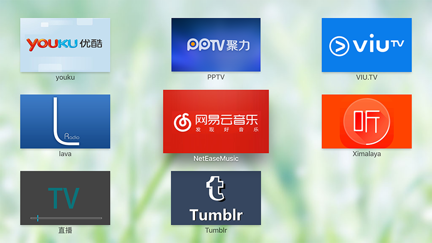 目前包括: youku, tumblr, neteaseMusic, lava, ximalaya, TV直播,pptv