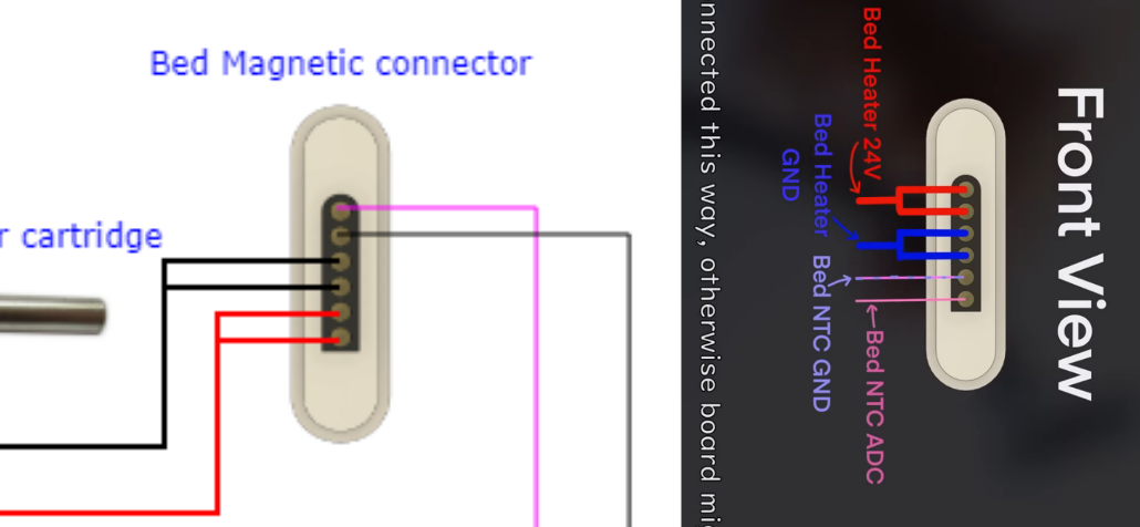 The PNG currently in the Electronics folder has the two lowest (square side) pins wired to Bed +/-, but the instruction video and the bed connector PCB have the thermistor pins lowest (square side) and the bed pins highest (round side)