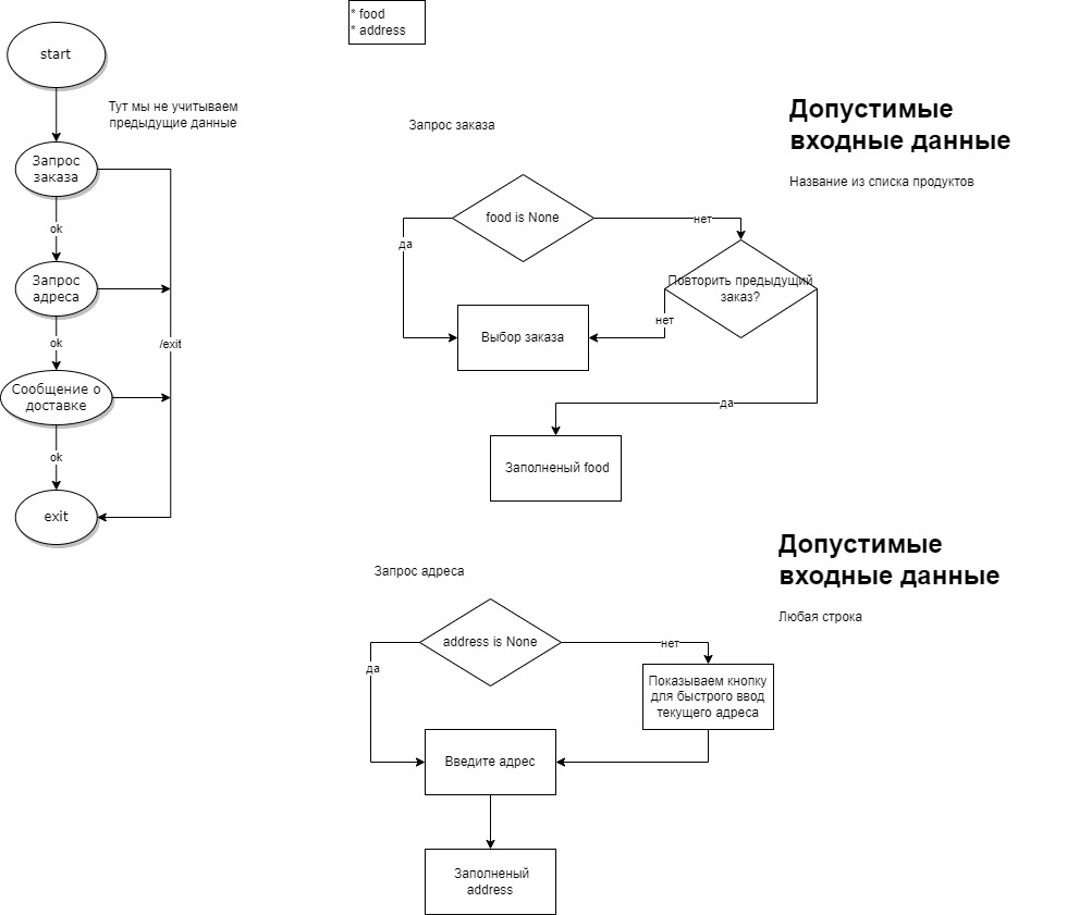 Надо написать бота для доставки еды. Бот должен спрашивать что мы закажем и адрес доставки.
