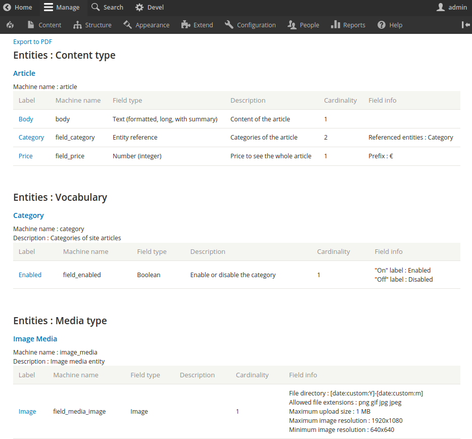 This interface is used to help create technical documentation (with PDF export) , or just quickly see all the entities types present on the website.