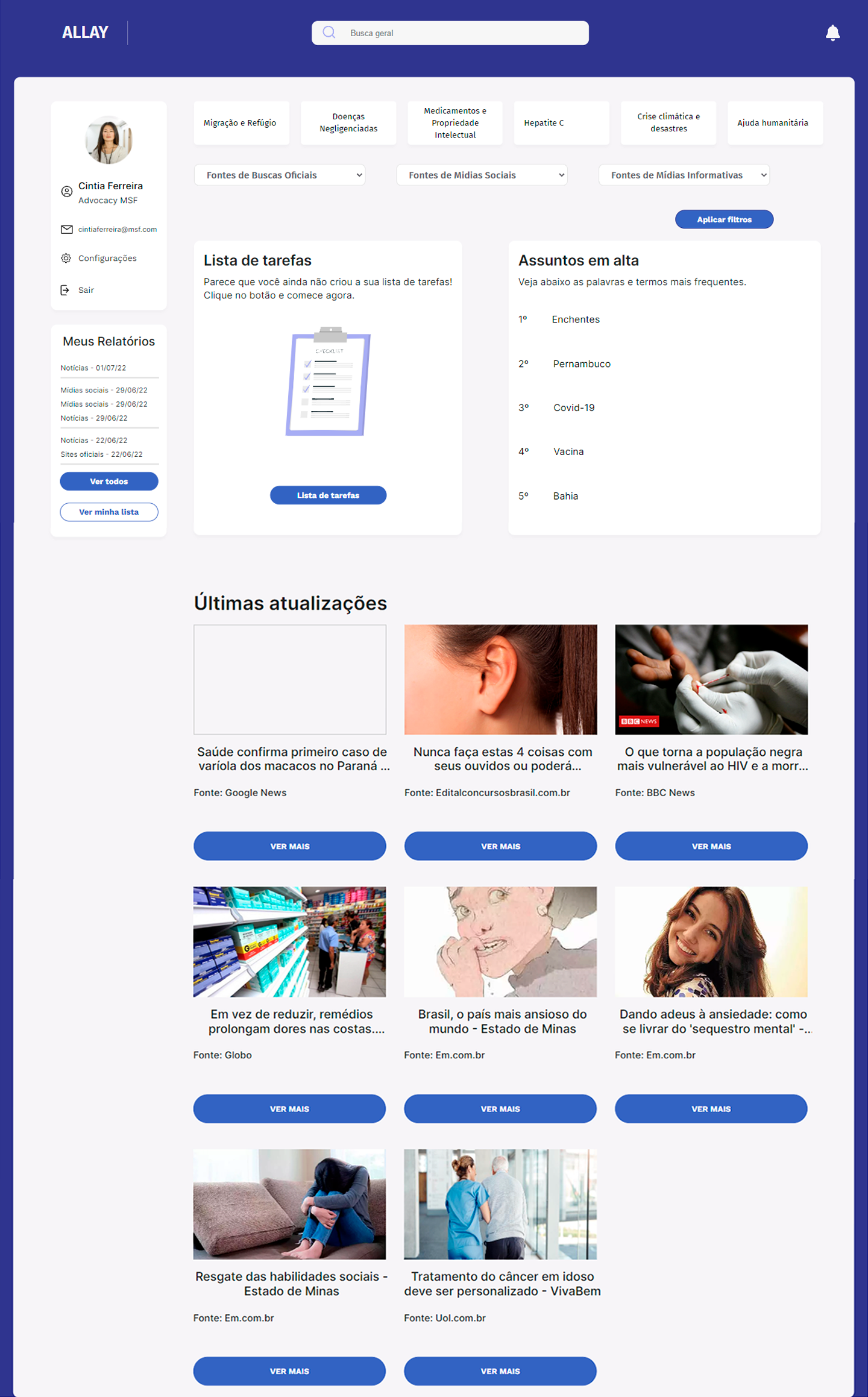 Protótipo de solução para o time de Advocacy dos Médicos Sem Fronteiras Brasil. Uma aplicação web que visa reduzir de tempo gasto pelo time da MSF Brasil em busca de informação, ela otimiza a pesquisa filtrando por tema, fontes confiáveis e regiões. Também visa organizar processos através de uma lista de tarefa e gerar práticos relatórios de informação.
