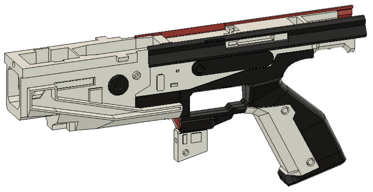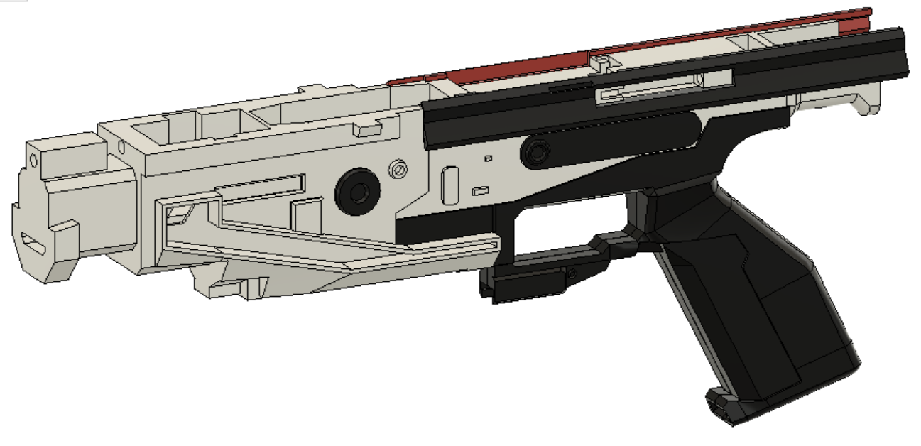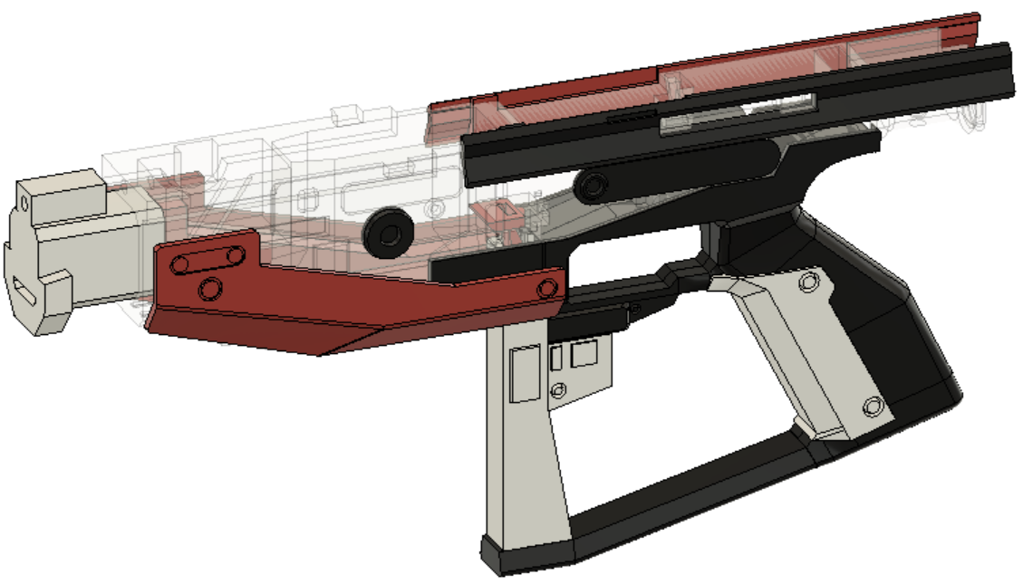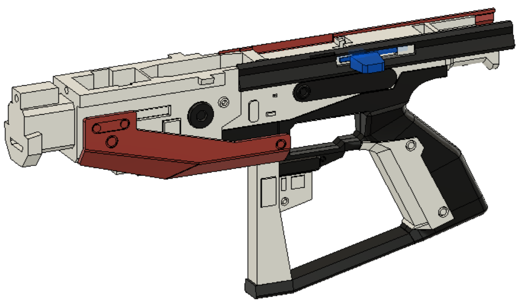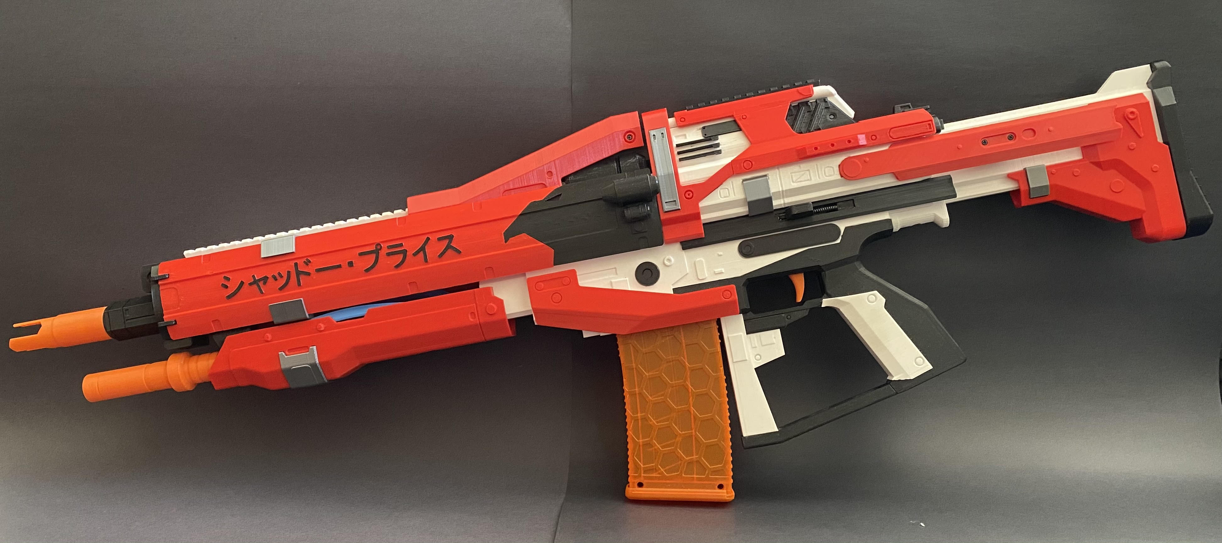 This is a Re-draw of Shadow Price with significant structural and aesthetic improvements that I made over the summer of 2020. It is now to-scale compared to in Destiny and much easier to edit. I plan to make all the other variants of stocks, barrels, and frames seen in the game. Internally, it is still BLDC flywheels and solenoid pusher, but now uses a 16 bit display ammo counter, and includes select fire. It also uses hardware to hold the blaster toghether, unlike the original which was mostly glued together. As a result, most visual components are separate parts, so even without paint the blaster should look very nice, and allows for color swaps if multiple aesthetic components are printed.