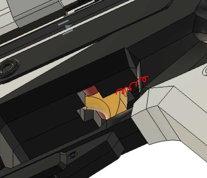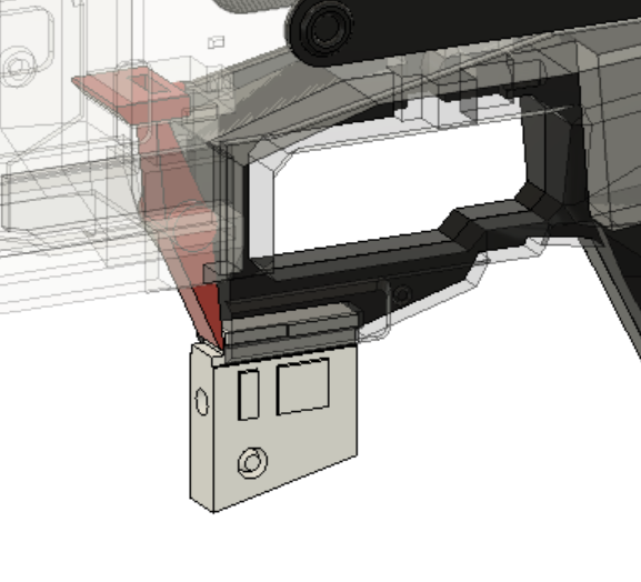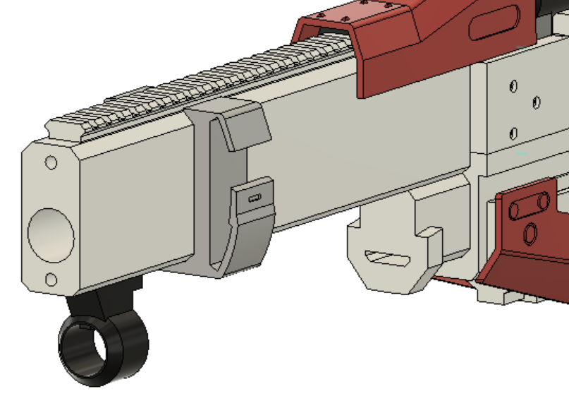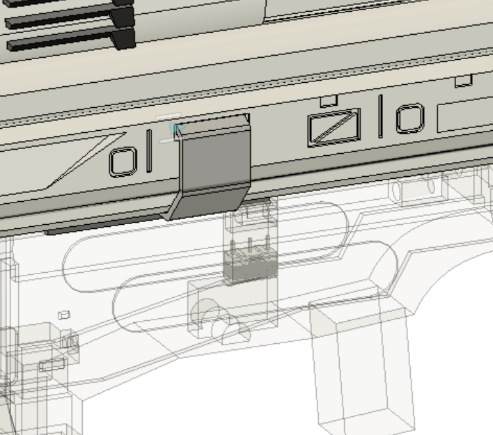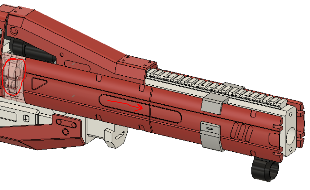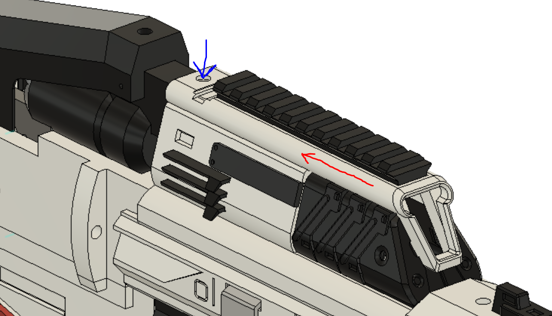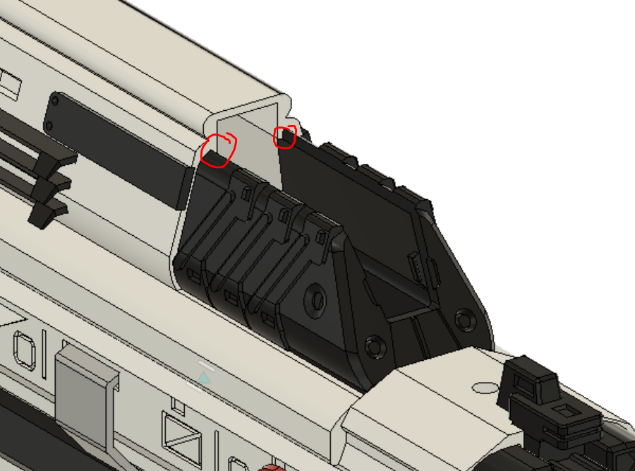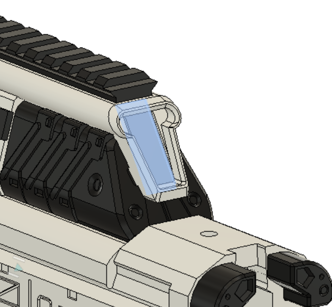 - Slot top of knuckle guard into lower, around the lever and mag release, then slot the tab into the recepticle in the handle and use a nerf screw to lock it in