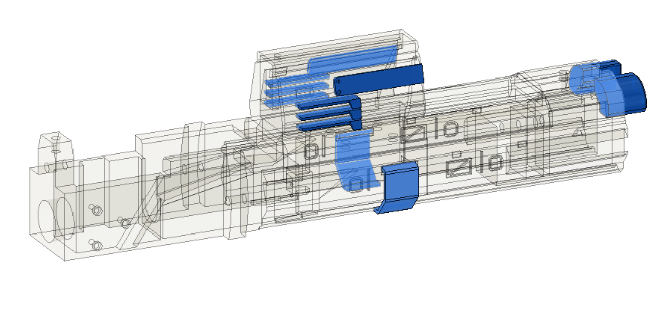 - Slot trigger and trigger axle into the hole in the trigger well, and add the final pen spring in the hole behind it (rotate them in then push up until it snaps in place)