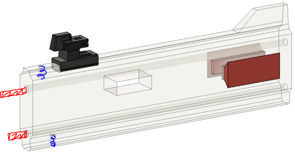 Slot ammo counter and picatiny assembly over the electronics and OLED (red arrow), then rotate the oled into the slot on the ammo counter and use the shorter M3 screw to lock it down (blue arrow)