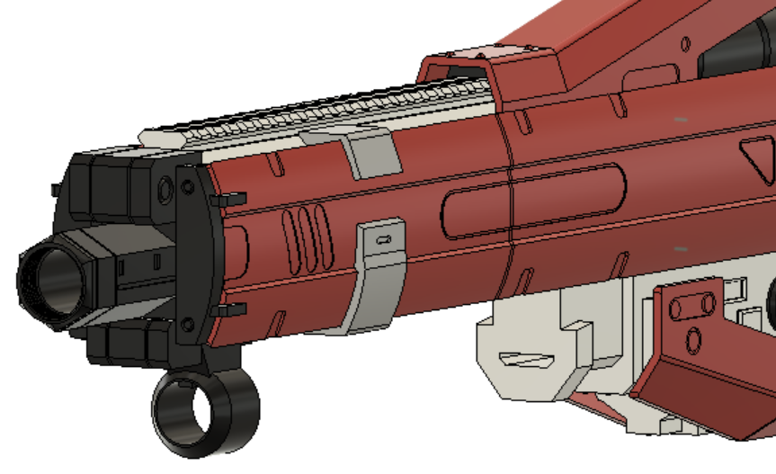 The provided STEP includes the two panels as single, large parts and a new barrel clip that does not extend into the central cutout. As long as you dont fill in the hole for the rod, the slot in the back, or the cutouts that mesh with the barrel in the front, you can add anything you want to the panels. If your printer is not large enough for a full panel (like mine) you can make a design along where you plan to cut the panel, like the eagle head on my personal blaster. Have fun with it and personalize your blaster to your tastes!