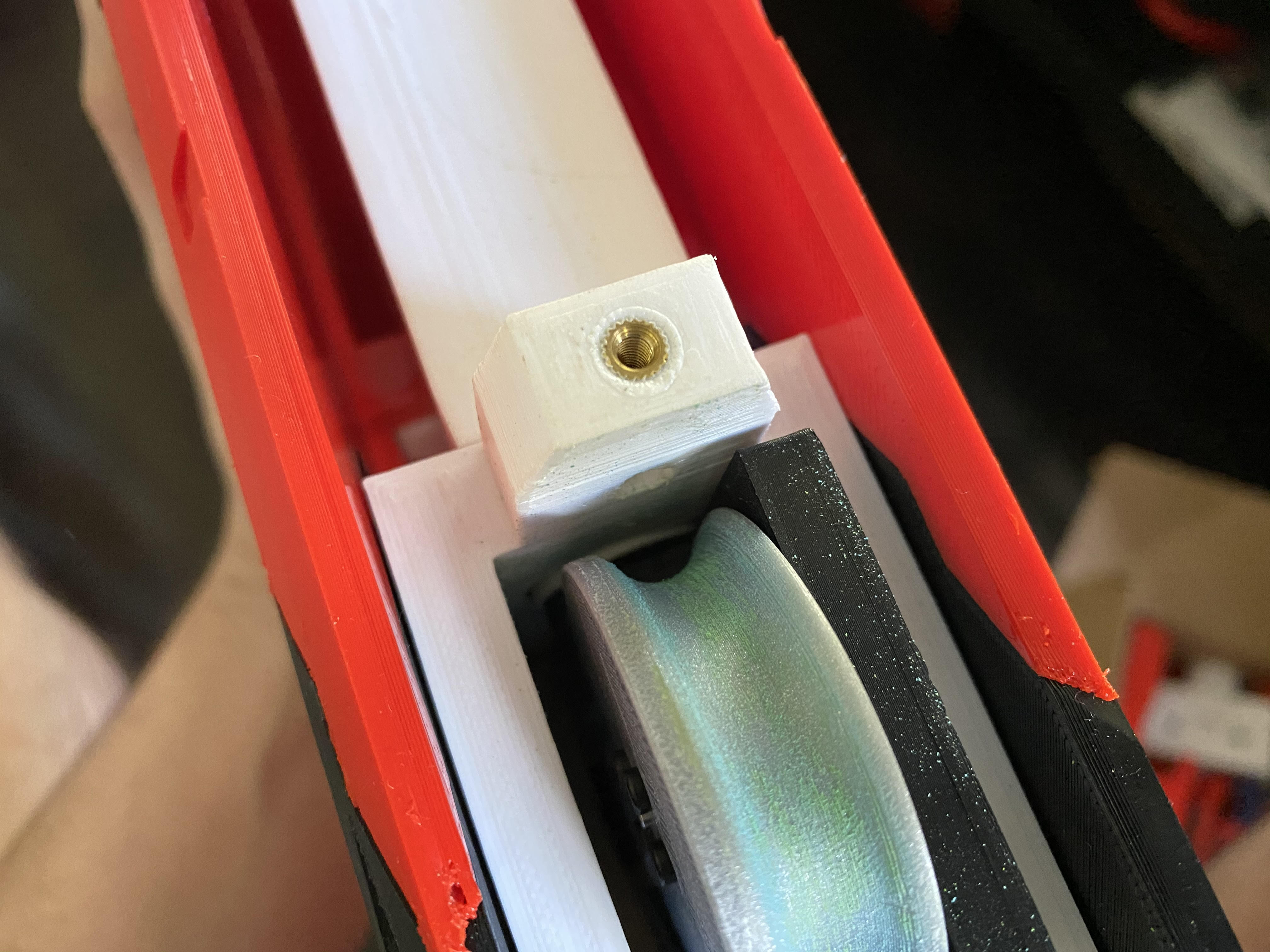 Add the final M3 Heat set insert into the hole marked by a red spiral