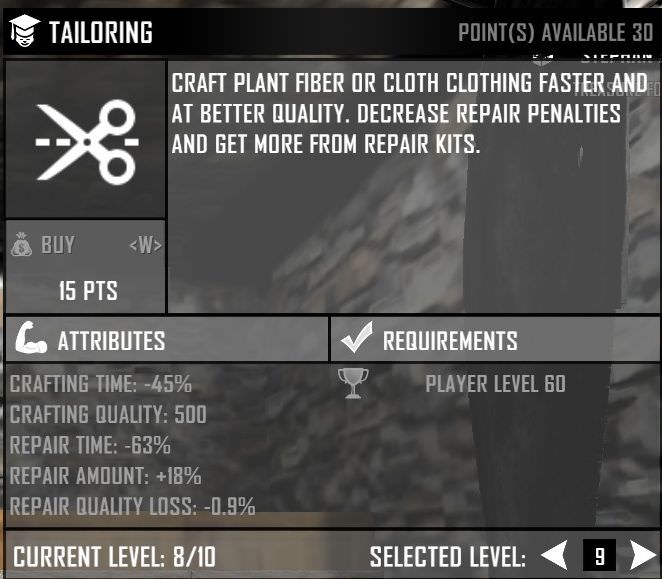 Crafting clothing now advances the Tailoring skill. Certain items of clothing can’t be repaired at the start of the game, because the recipes are now tied to the perk Tinker, Tailor, Etc., and are therefore not available for crafting until the appropriate level has been unlocked. This means that brown versions of clothing (like brown shorts, or brown sweatshirt) can’t be crafted or repaired until the skill has been learned.