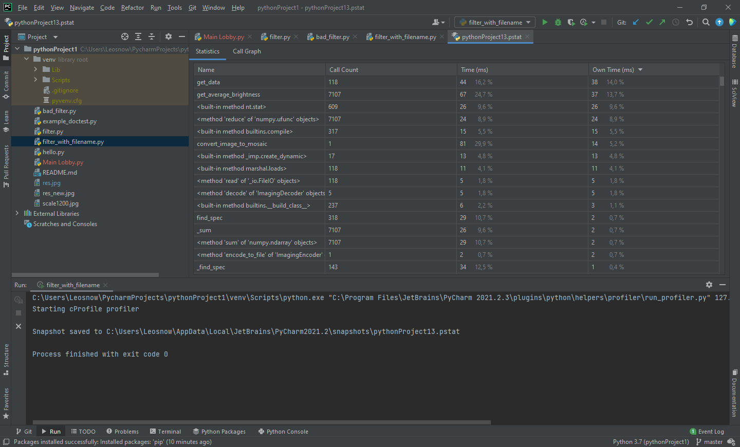 - ΠΠ°ΠΏΡΡΡΠΈΡΠ΅ Ρ ΠΏΠΎΠΌΠΎΡΡΡ Π²ΡΡΡΠΎΠ΅Π½Π½ΠΎΠ³ΠΎ ΠΏΡΠΎΡΠΈΠ»ΠΈΠ·Π°ΡΠΎΡΠ° Π² PyCharm Π²Π°Ρ Π½ΠΎΠ²ΡΠΉ filter.py, ΡΠ΄Π΅Π»Π°ΠΉΡΠ΅ ΡΠΊΡΠΈΠ½ΡΠΎΡ ΡΠΎ Π²ΡΠ΅ΠΌΠ΅Π½Π΅ΠΌ Π²ΡΠΏΠΎΠ»Π½Π΅Π½ΠΈΡ.