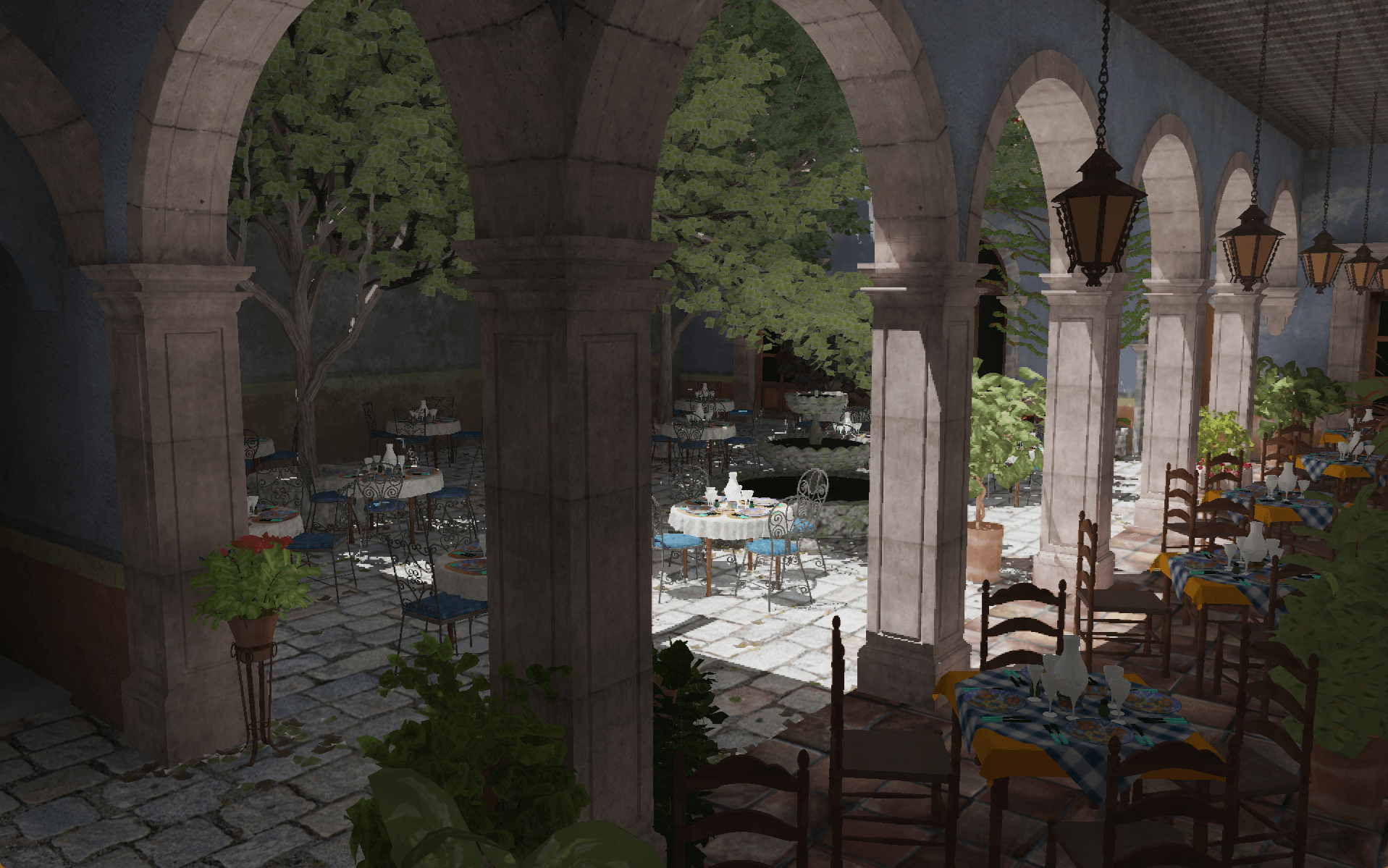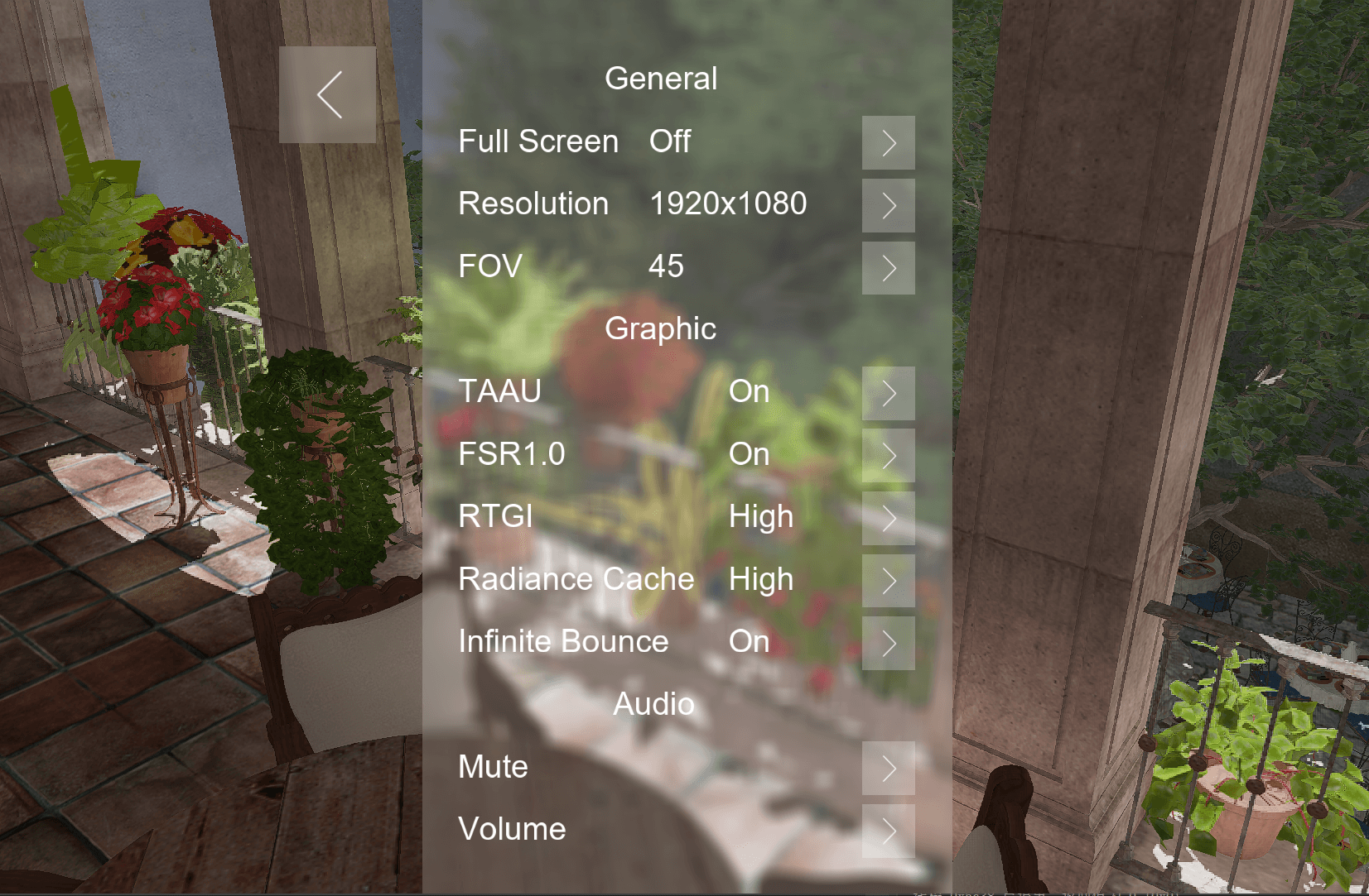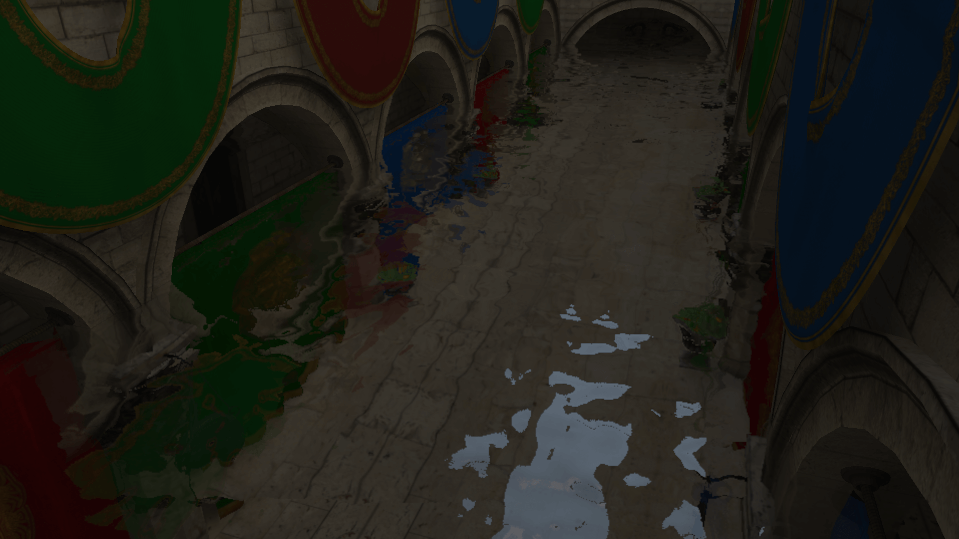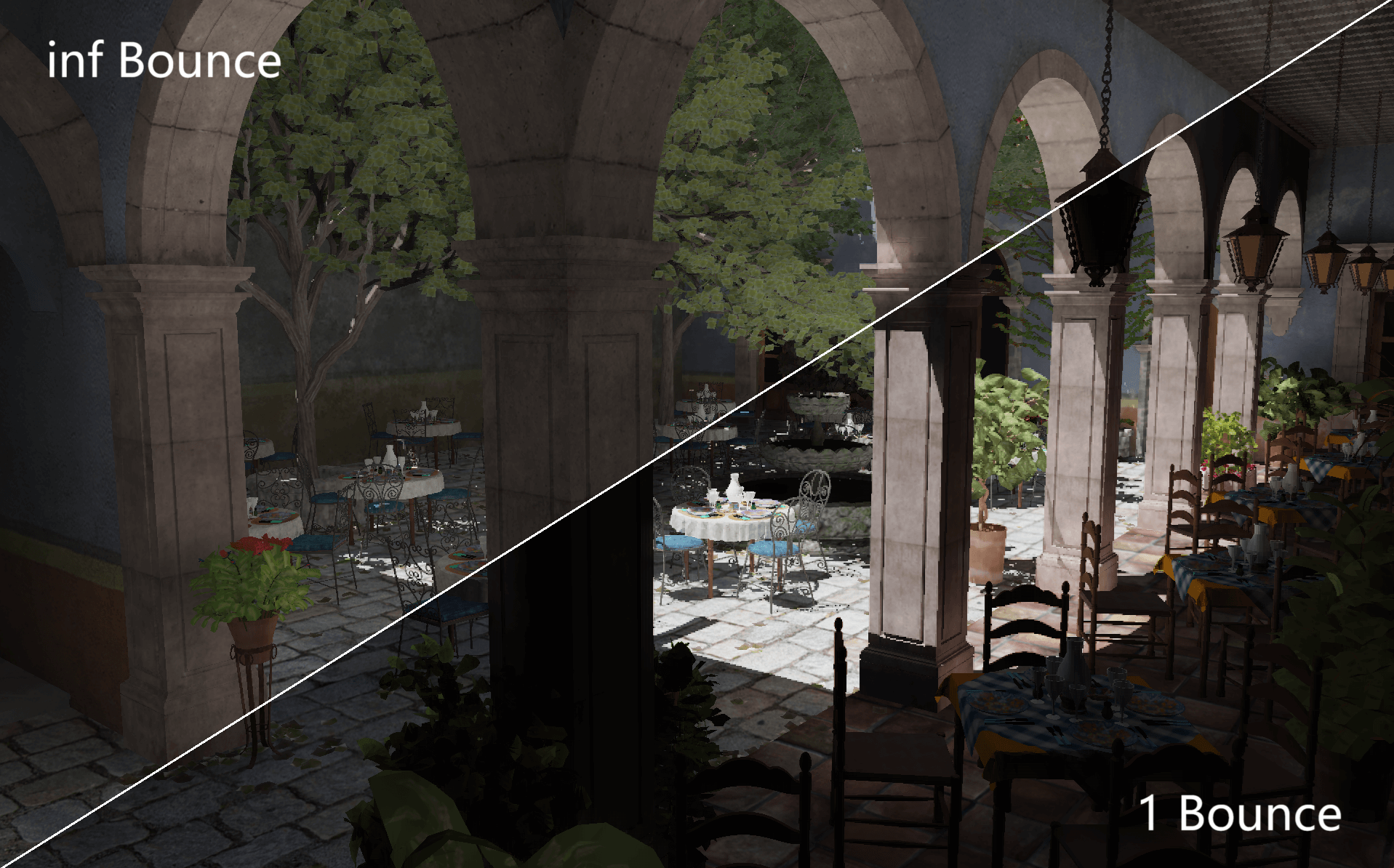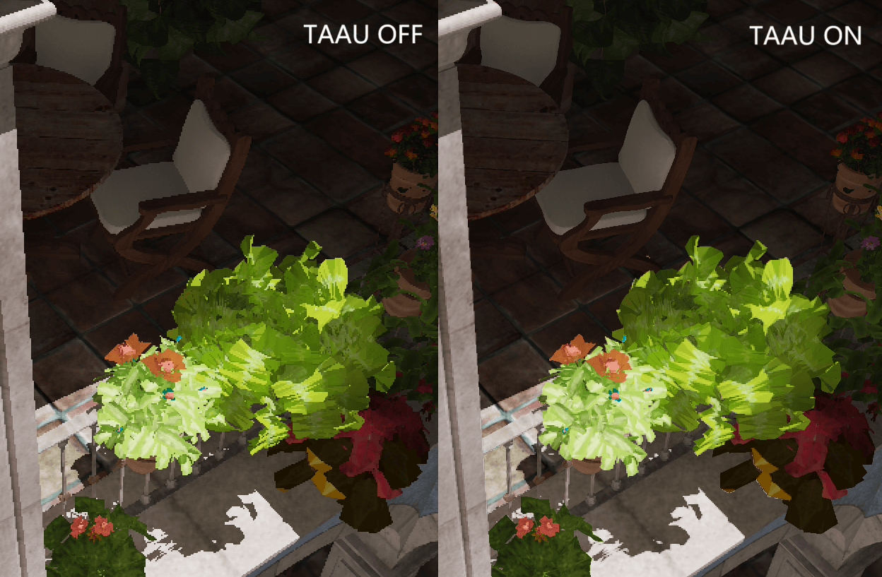 为抵消光线查询所造成的开销,渲染器默认以半分辨率(四分之一像素量)进行渲染,每帧为投影矩阵添加一个微小的抖动 (jitter) 来更新每组中的下一个像素,在帧生成时间较低的情况下造成的延迟可以忽略不计。由于画面由原生半分辨率合成得到,硬件纹理过滤效果有限,但总体在可接受范围。