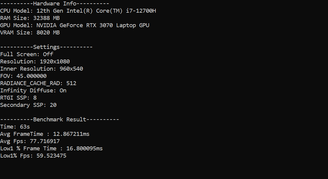 为当前图形设置在默认场景(Sponza)之上提供标准化性能测试,生成包含硬件信息与 Low1%,Avg及帧生成时间等测试结果的性能报告以协助调试。